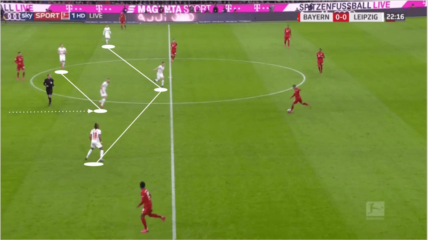 In the image above, Leipzig’s structure is incredibly compact, almost looking like a 5-1-4 with Konrad Laimer stepping in between his forwards to prevent passes into the centre of the pitch. While not in the image, Leipzig’s backline is quite high, which does invite aerial passes over the top of the defence. Daley Sinkgraven and Nadiem Amiri, who both started as wing-backs in Leverkusen’s last match, need to be aware of this and ready to defend those passes properly. While Bayern will inevitably get higher up the pitch, Leverkusen need to remain compact while also communicating effectively when Bayern quickly switch the point of attack, making sure they have each Bayern attacker accounted for as they shift over.