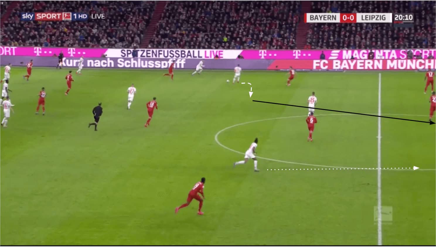 As Leipzig did here, Leverkusen can look to exploit Bayern’s willingness to commit men forward, especially their outside-backs. Above, Sabitzer latched onto a loose ball that was created by forcing an aerial pass from Kimmich. As soon as he was in possession, Christopher Nkunku began his run in behind. While Davies does have the speed to catch up to almost anyone in the Bundesliga, body positioning becomes important. Whoever is on the wing, whether it be Diaby or Bailey or someone else, they need to look to step into the path of Bayern’s outside-backs to prevent them from making a tackle.