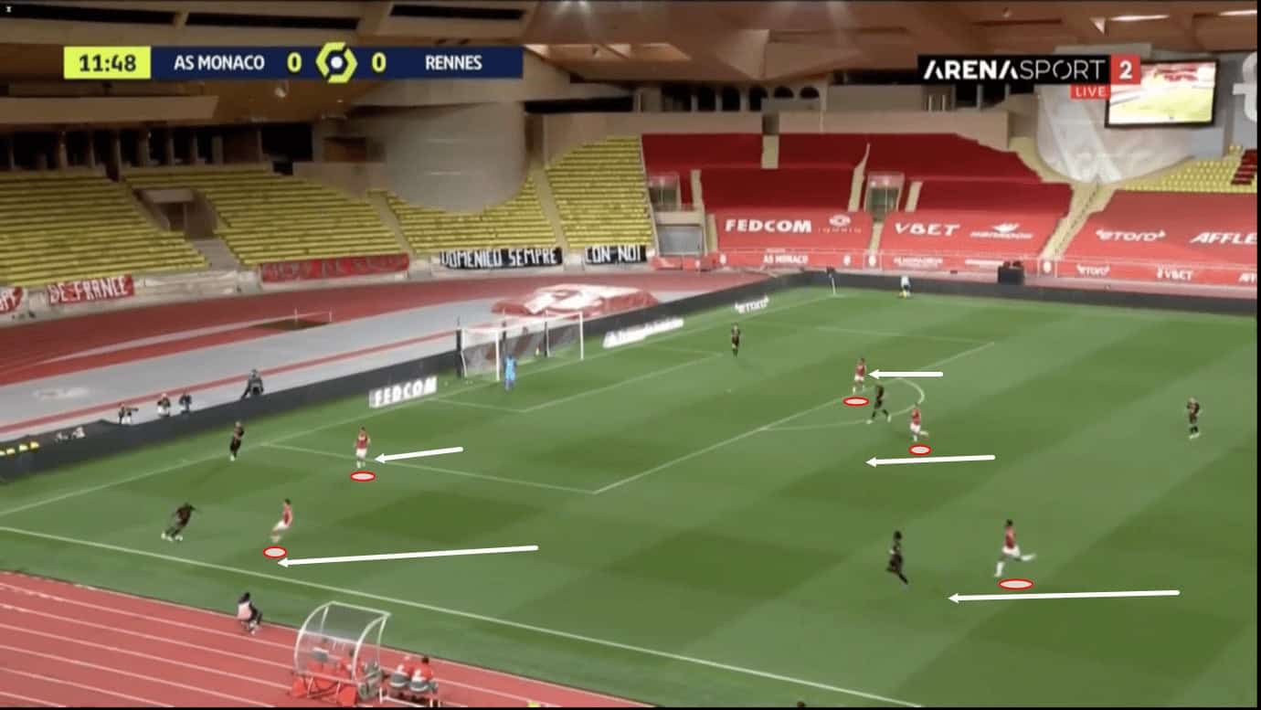 Knowing that they were playing with a 4-2-3-1 in this game, and just before this image the centre-back was on the ball, we see that as the right-back received possession, Monaco’s left-winger pushed out from the fairly central position we know that he occupies, to close down the full-back. While the ball-near winger closes down the full-back, Monaco’s centre-forward advances onto the nearest centre-back, blocking off that passing option. Les Monégasques’ ball-far winger comes inside to maintain access to the opposition’s other centre-back and holding midfielder, who’s also occupied by Monaco’s ‘10’, while it’s also common to see Monaco’s ball-near central midfielder advance to provide support to the winger, especially when the opposition central midfielder drops as we see here.