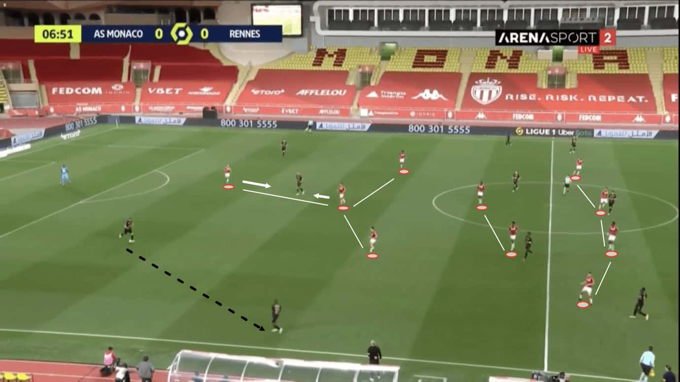 Here, Rennes’ right centre-back is on the ball without much pressure, but Monaco’s ‘10’ and centre-forward play a vital role in initiating the press by cutting off this player’s access to the other side of the pitch through their positioning. This effectively cuts the pitch in half and thanks to that, as well as the midfield congestion, the opposition are forced out wide. Once the full-back receives the ball, Monaco’s press becomes more aggressive. This is typical of their defensive tactics and we expect to see them try and play this way versus Paris.