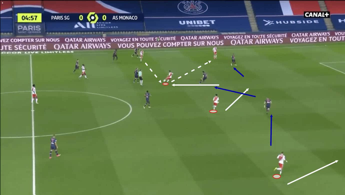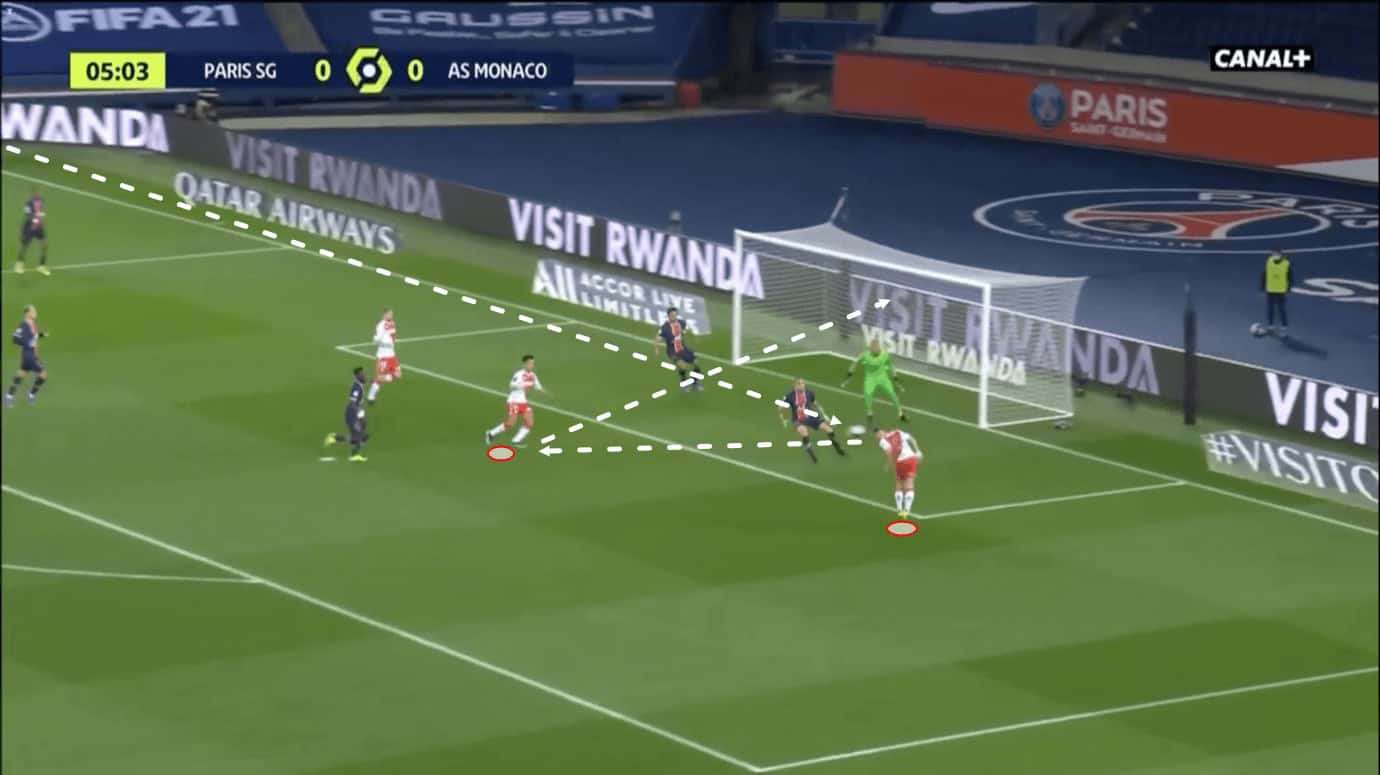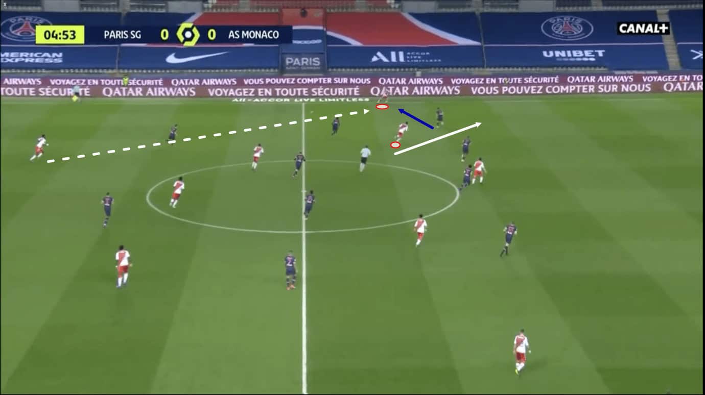 Monaco could be wise to try and get the full-backs isolated like this by forcing them into wide areas and doubling up on them, while PSG’s holding midfielders must be more aggressive about preventing this gap from being exploited by closing down the ball carrier quicker and being aware of the passing lane that’s opened up.