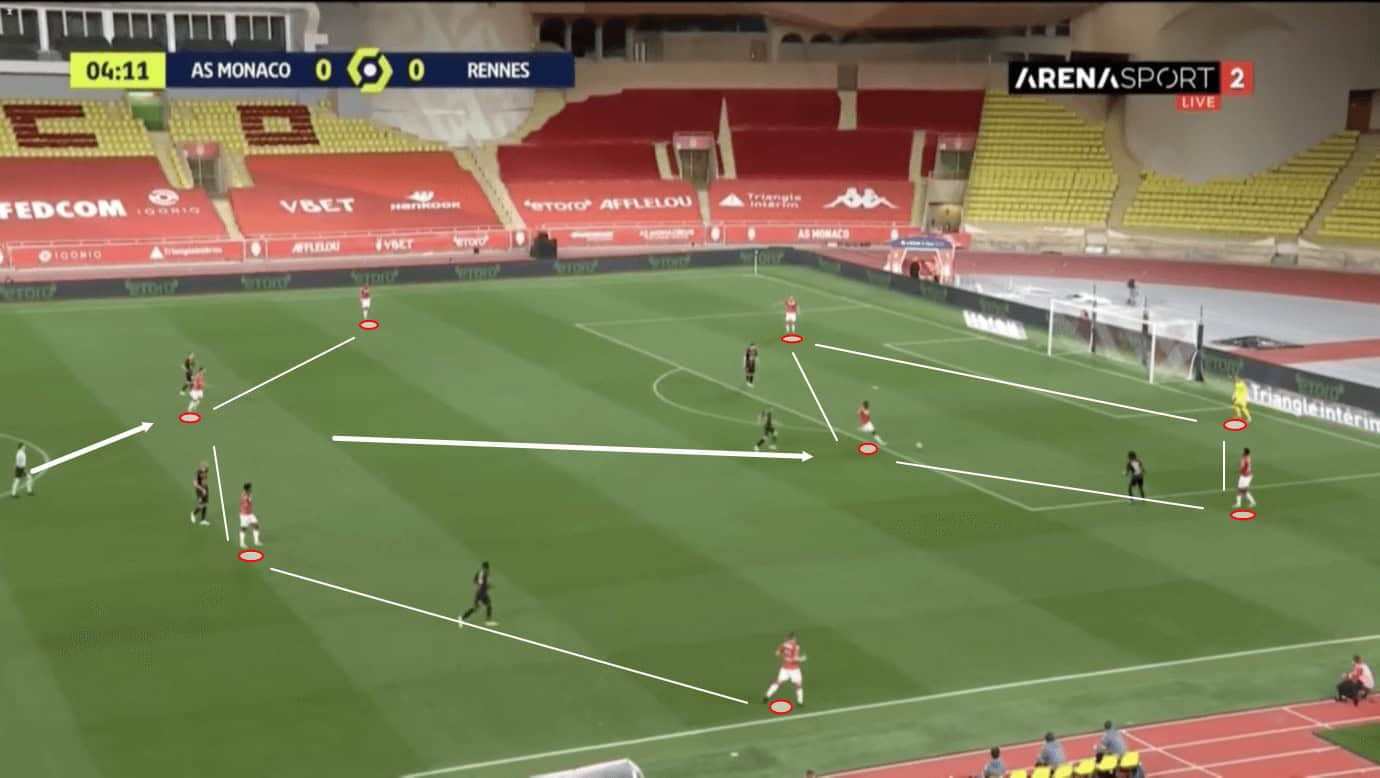 During earlier stages of build-up, Monaco generally shape up as we see them in figure 7, with the full-backs staying wide, one central midfielder dropping and one more advanced player – often one of the centre-forwards – filling his place in central midfield. This movement is different to what we described before, which is how Monaco’s shape develops as they advance slightly further up the pitch, but this still creates Monaco’s 3-4-2-1 shape.