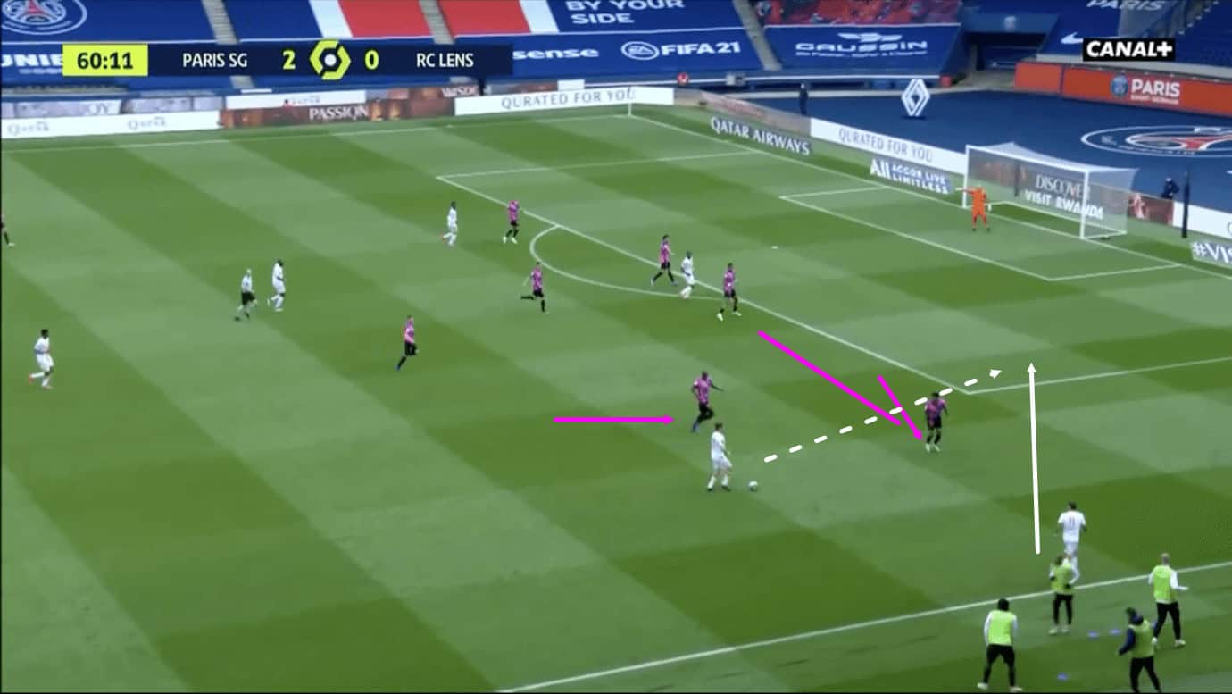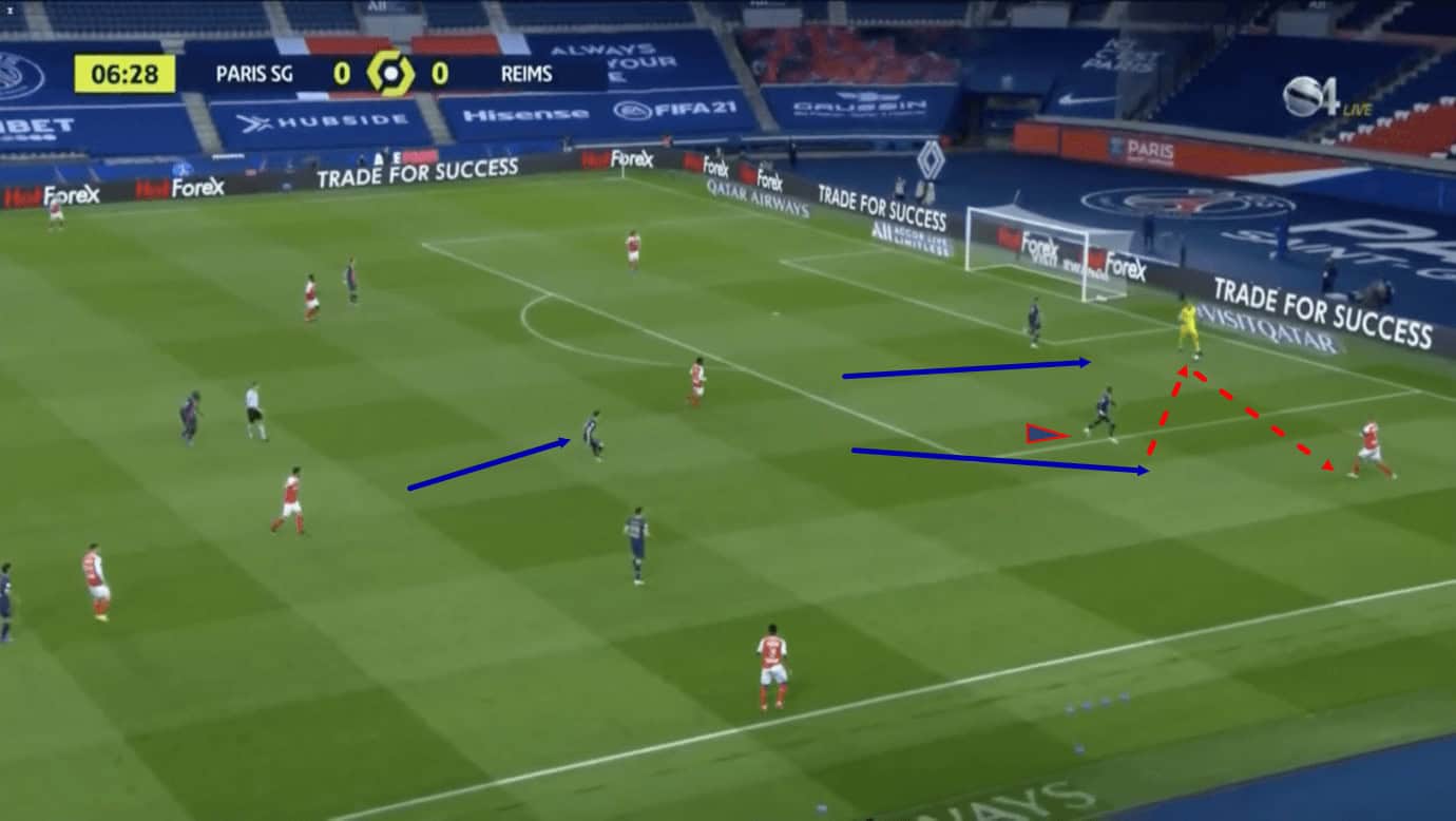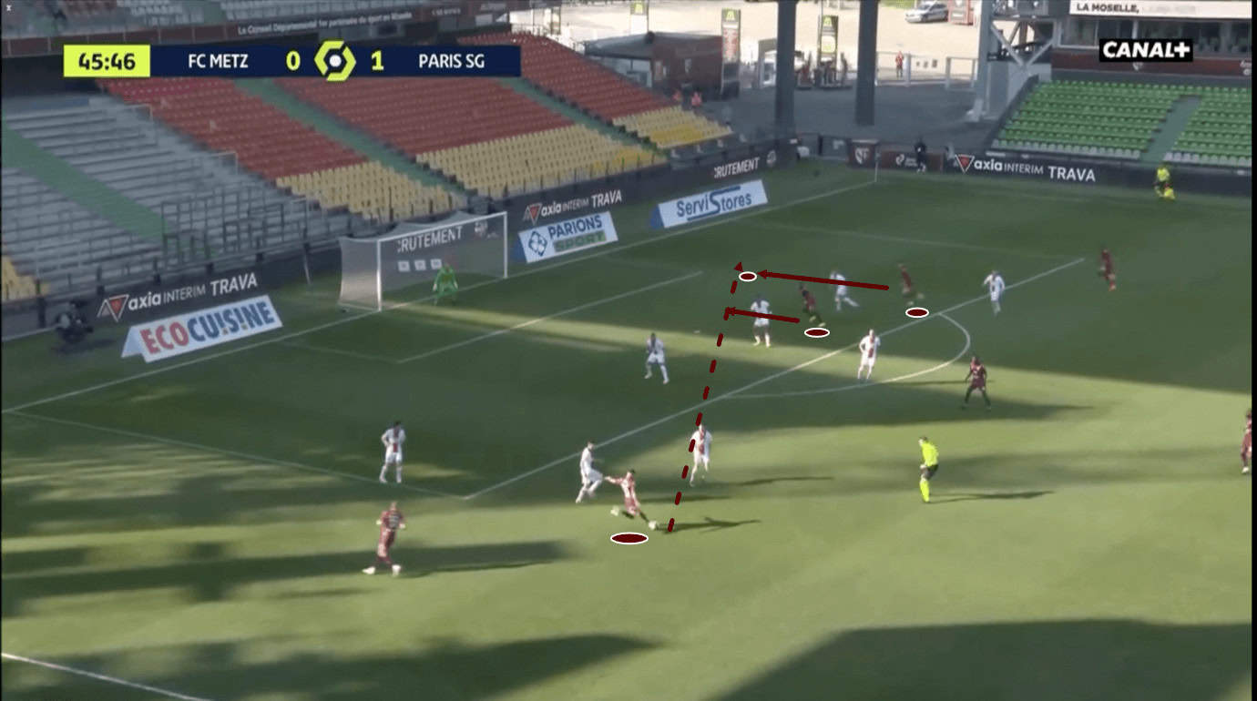 As play moves on, the centre-forward opts to make use of the runner on the left-wing who was ignored previously, which proved to be a wise move as this player successfully beat PSG’s right centre-back in a 1v1 out wide and managed to pull off a lethal cross to the back post – exploiting yet another one of the PSG weaknesses which we analysed in the previous section.