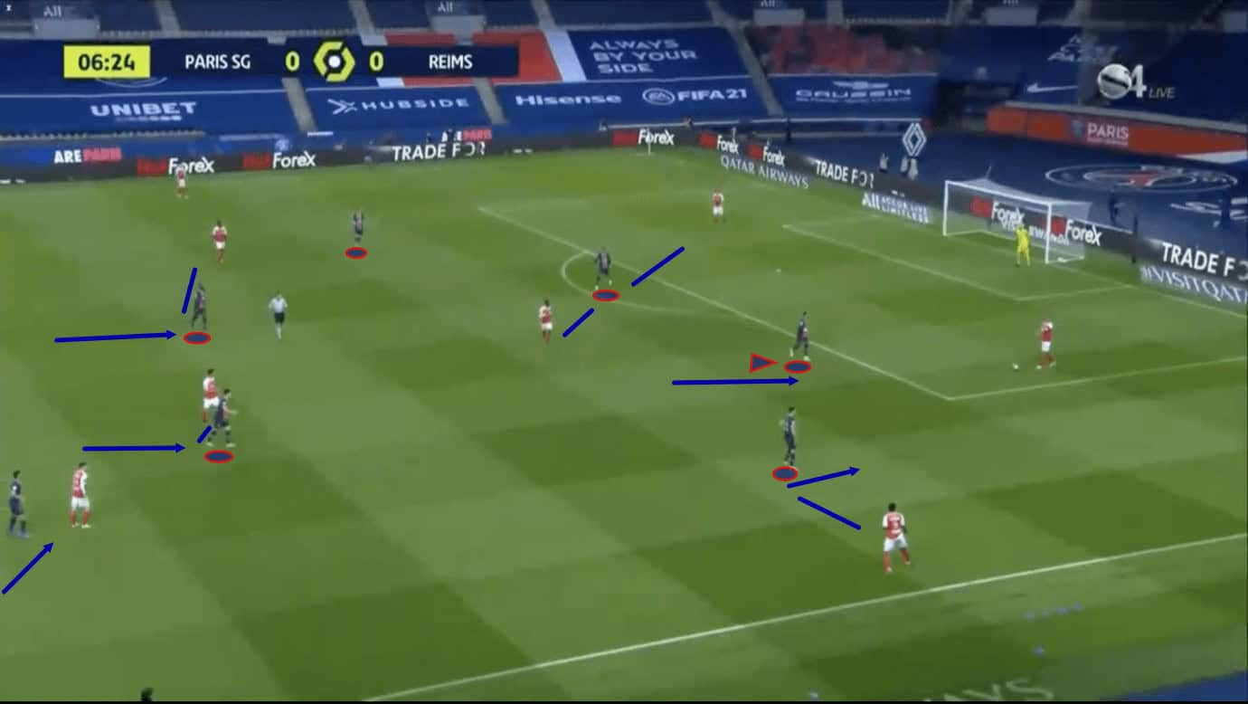 Centre-forward Kylian Mbappé also retains access to the holding midfielder, along with the right centre-back should the opposition look to switch play. Right-winger Ángel Di María retains access to the ball-side opposition full-back, though doesn’t block off that pass entirely, while the holding midfield duo advance while marking opposition midfielders. At this stage, PSG’s primary focus is on preventing the opposition from playing through the centre of the pitch, as this area provides a more direct route to goal, and players in the centre have a greater area of the pitch to play into than players on the wings.