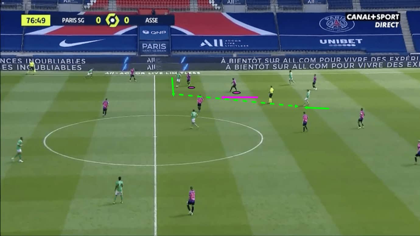 In figure 3, we see that Les Parisiens’ right defensive midfielder advanced from his deeper position as the Saint-Étienne ball carrier dribbled past PSG’s right-back. As mentioned, it’s common for these players to advance and defend higher, but it’s also been common throughout the season for PSG to get punished for this with the opposition exploiting space that opens up between the midfield and defensive lines, which was the case in this example, as an opposition forward dropped to take advantage of the space vacated by PSG’s holding midfielder, making himself a dangerous passing option for the ball carrier.