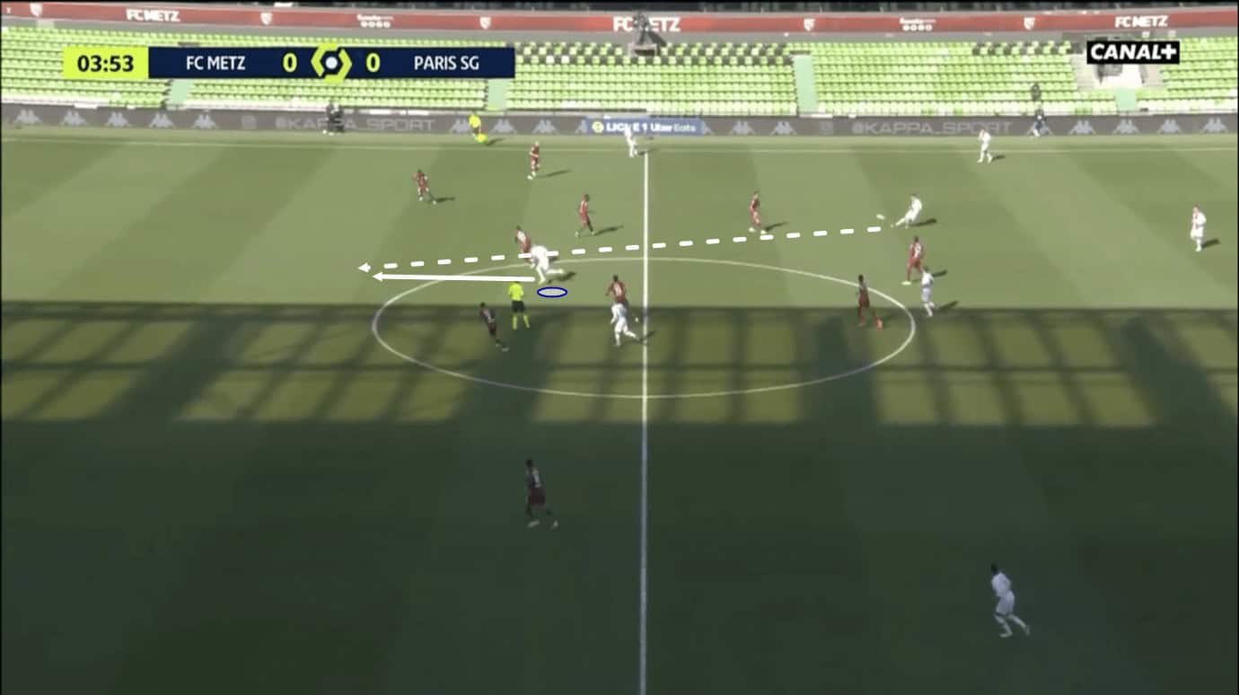 Like Paredes, this player – often Neymar or Verratti, but with both players like to be absent for Wednesday’s game, possibly Rafael Alcântara or Julian Draxler – is generally an accomplished playmaker and when they find space in the deeper position, they can either carry it forward themself, creating a panic for the opposition in the final third and potentially creating space for teammates by attracting pressure, or play the ball through to a more advanced teammate in a good position. This is a common tactics for PSG under Pochettino and we expect to see them try and do this on Wednesday.