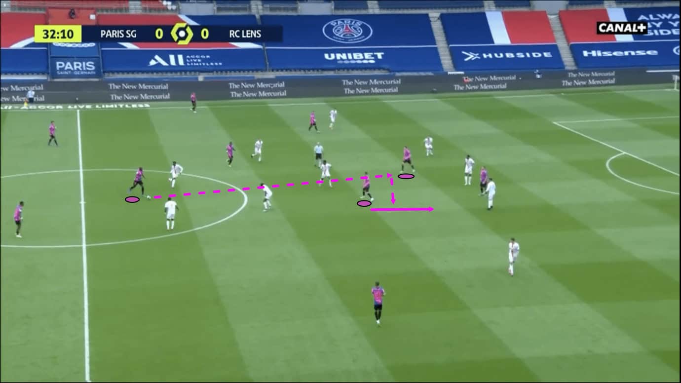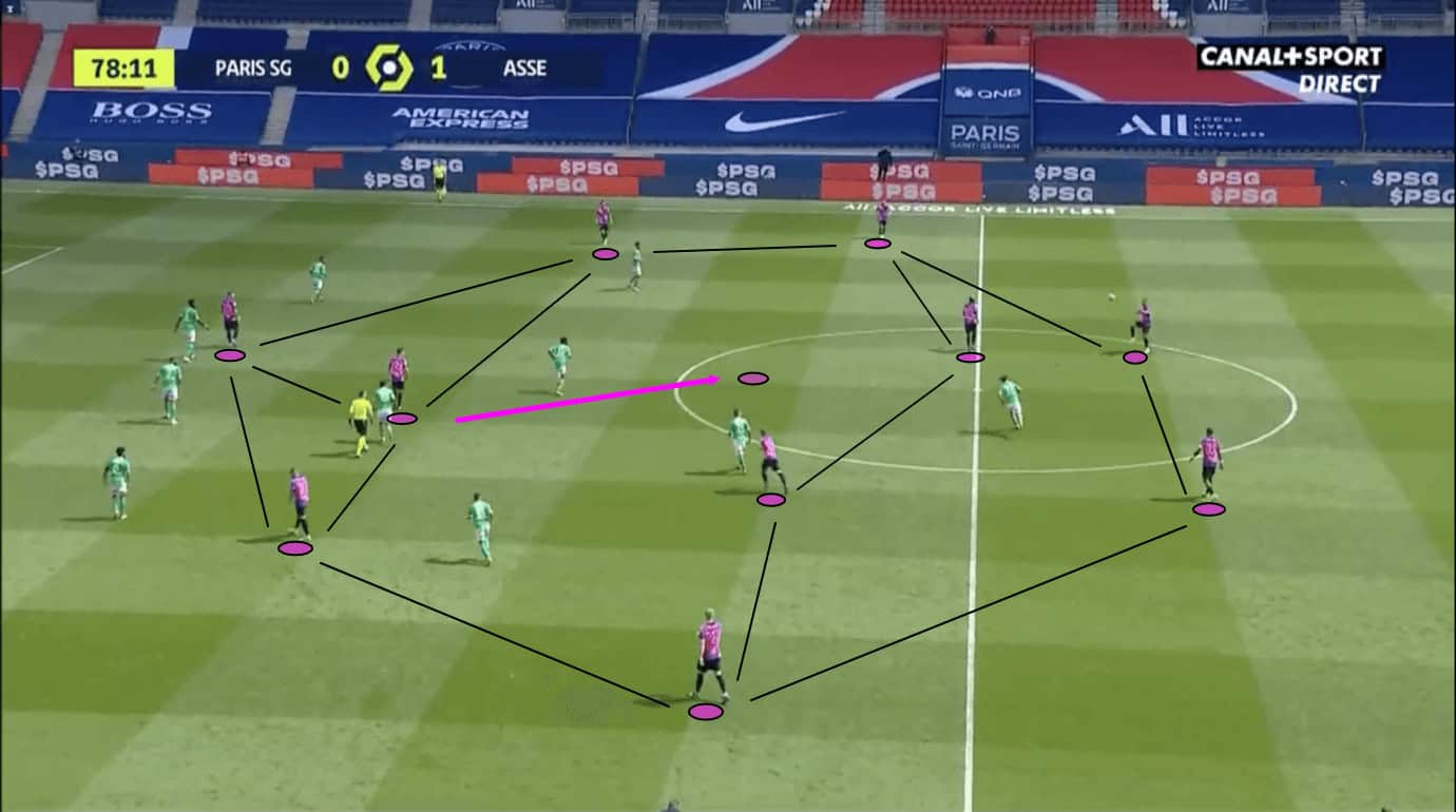 Additionally, it’s been common to see PSG’s ‘10’ drop deep in a similar way to how Paredes drops, except instead of splitting the centre-backs, he splits the central midfielders, boosting PSG’s presence in central midfield, helping them to create an overload, and finding more space than he had in the more advanced position by losing a marker – similarly to Paredes. In figure 13, for example, PSG’s ‘10’ dropped as the passage of play moved on, losing the player who we can see tightly marking him in this image and helping his side to create a 3v2 advantage over the opposition’s central midfielders.