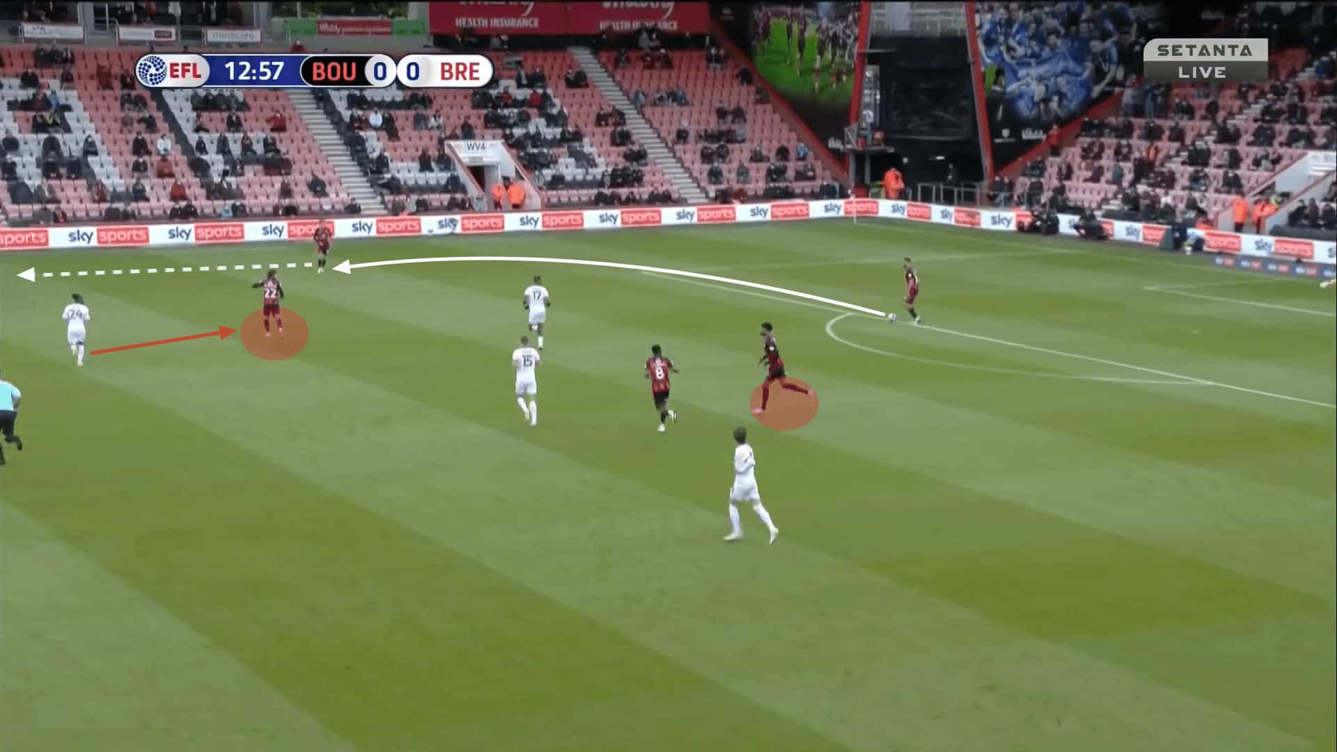 We know that Bournemouth will mostly look for their opportunities through counter-attacks and that Brentford will mostly have possession. However, given the Brentford tactics, we saw some space for Smith on the right side when Brentford is trying to disrupt Bournemouth defence with their press. Movements from Bournemouth midfielders can sometimes engage Brentford players on them which then allows Smith to receive the ball without pressure and he is capable of progressing it further. On the other side, Bournemouth won’t progress that much since Kelly is more defensively oriented and even acts as 3rd centre-back in some situations. If Frank puts Henry instead of Canos on left wing-back we will probably see a little more intensity on Smith than what Canos offered.