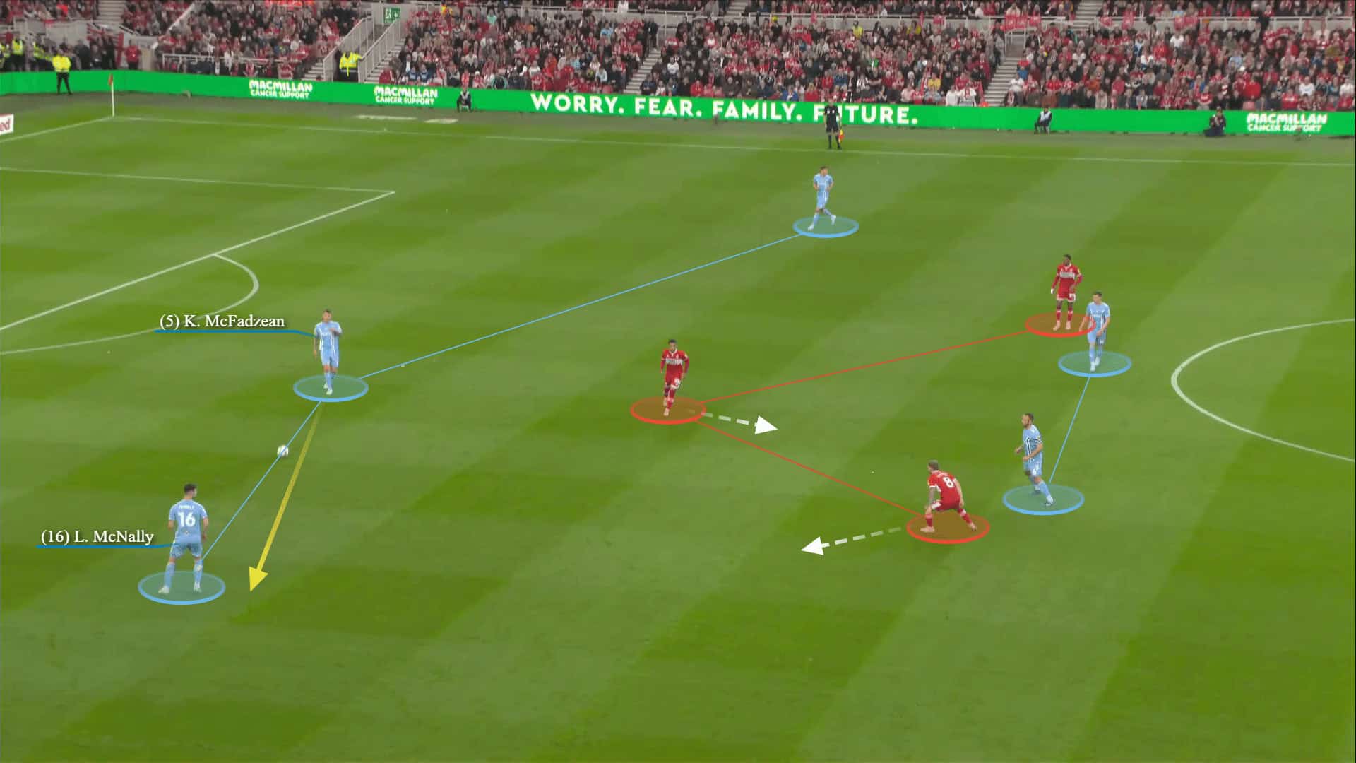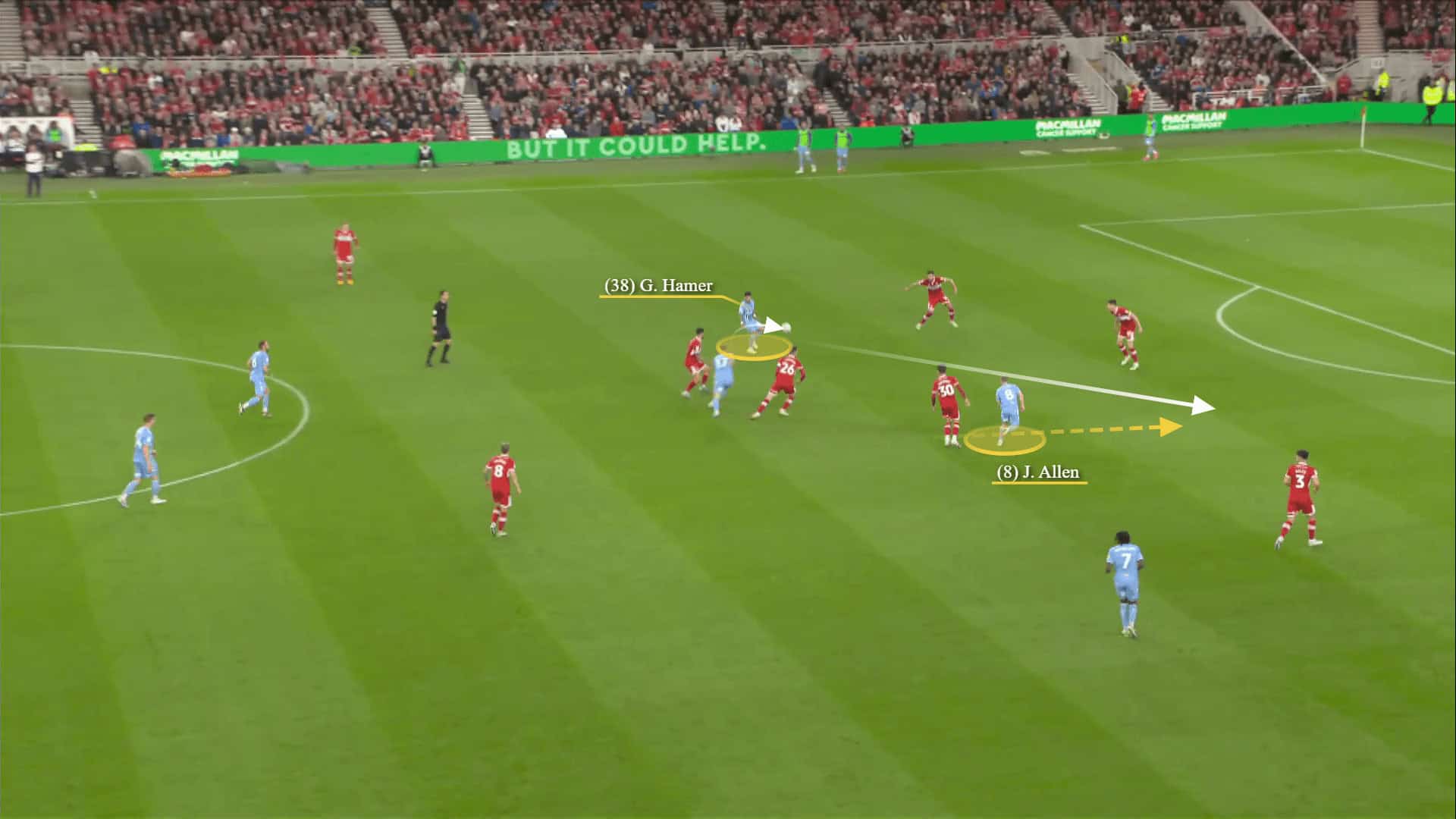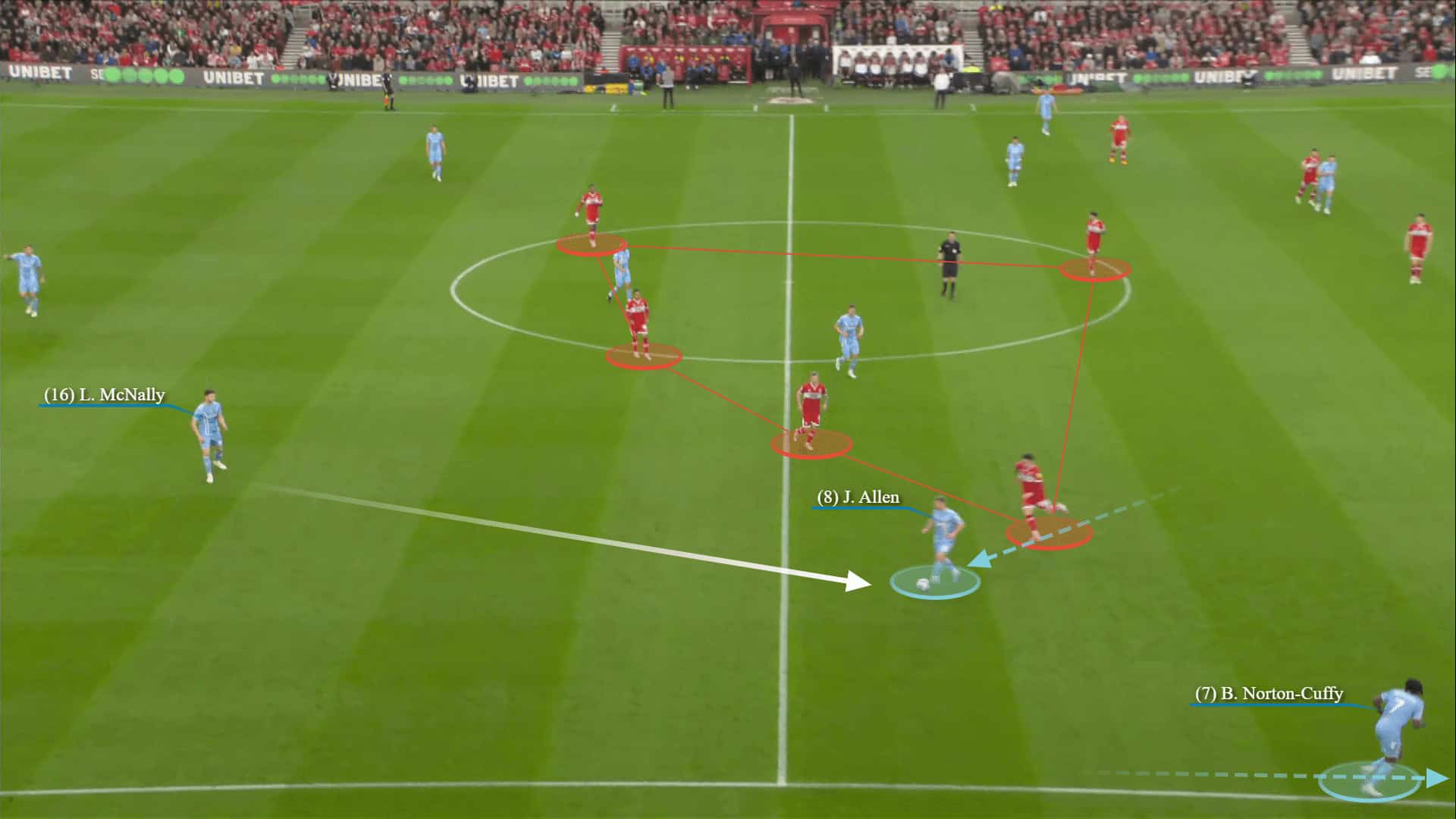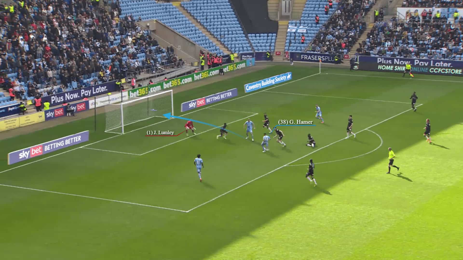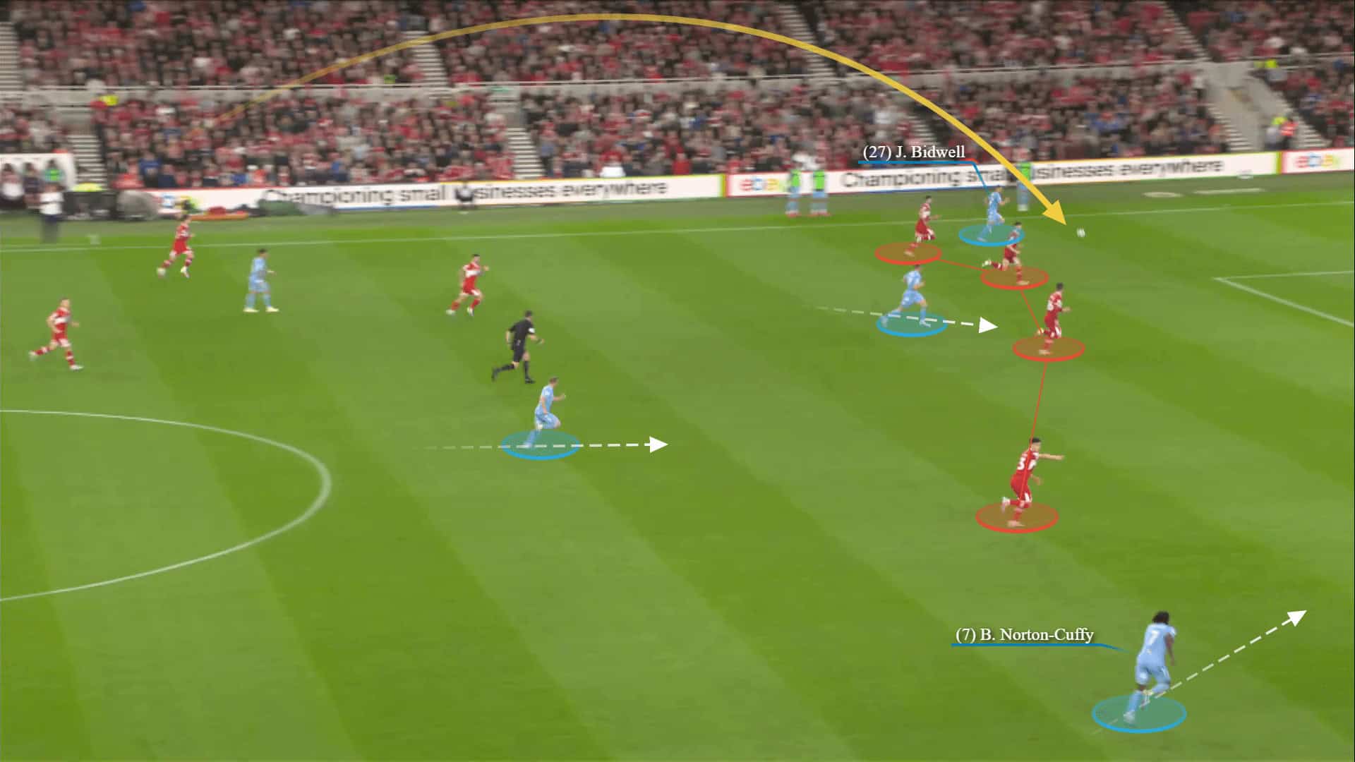 The Sky Blues opt for long goal kicks, as is highlighted in the below graphic, rather than short build-up play, maintaining a mentality focused on targeting their striker, with an emphasis on winning second balls or creating opportunities for runs in behind.