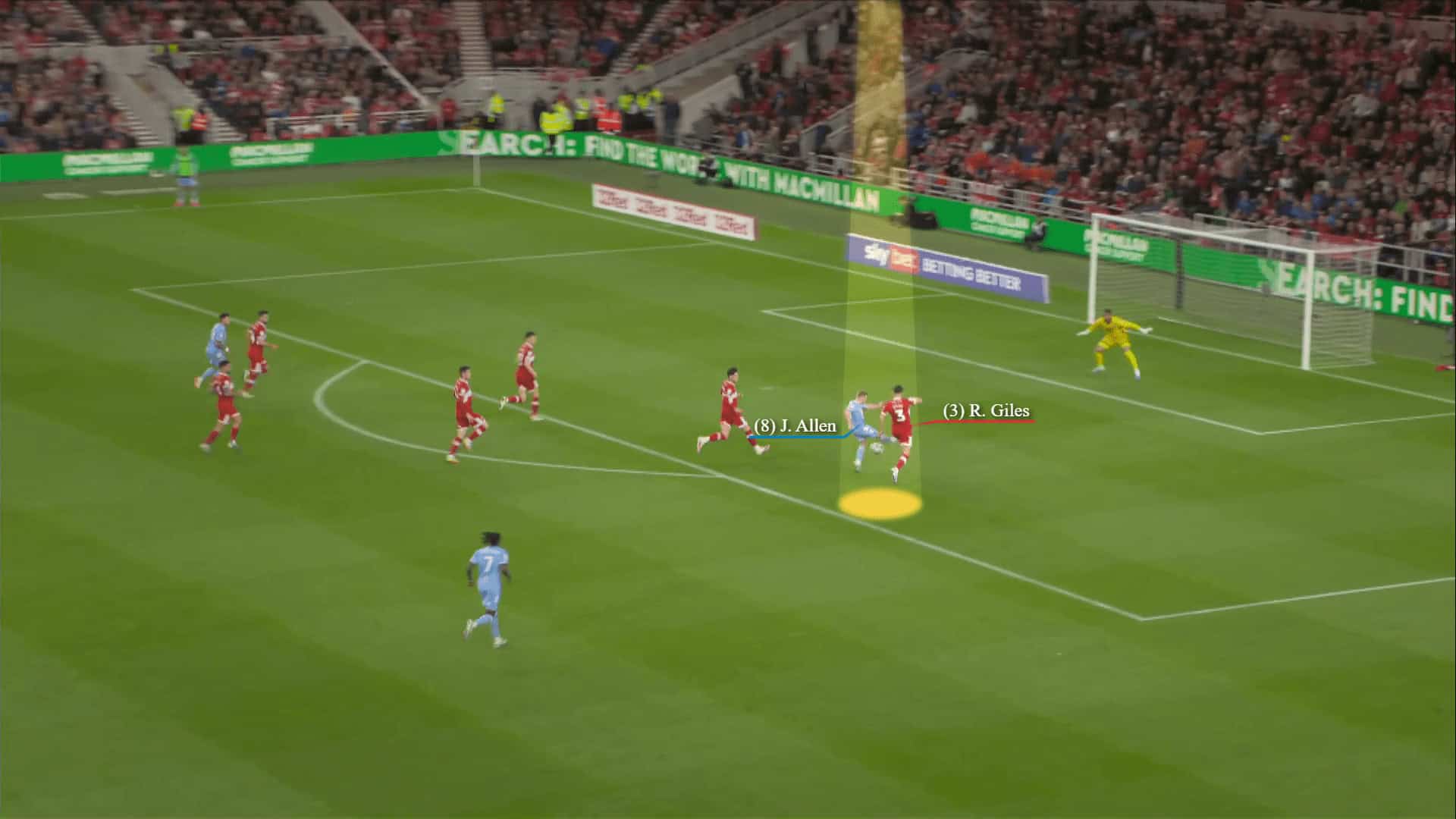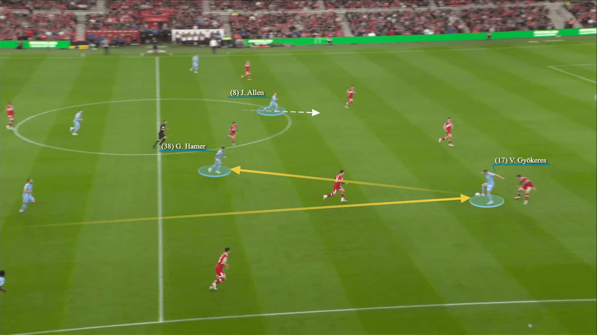 In their semi-final second leg match for this final, the goalkeeper Ben Wilson plays long towards Viktor Gyökeres who drew Darragh Lenihan high to contest the ball with him while Gustavo Hamer and Jamie Allen are attacking the space, and the duo Ben Sheaf and Liam Kelly in the second wave are ready to win the second ball.