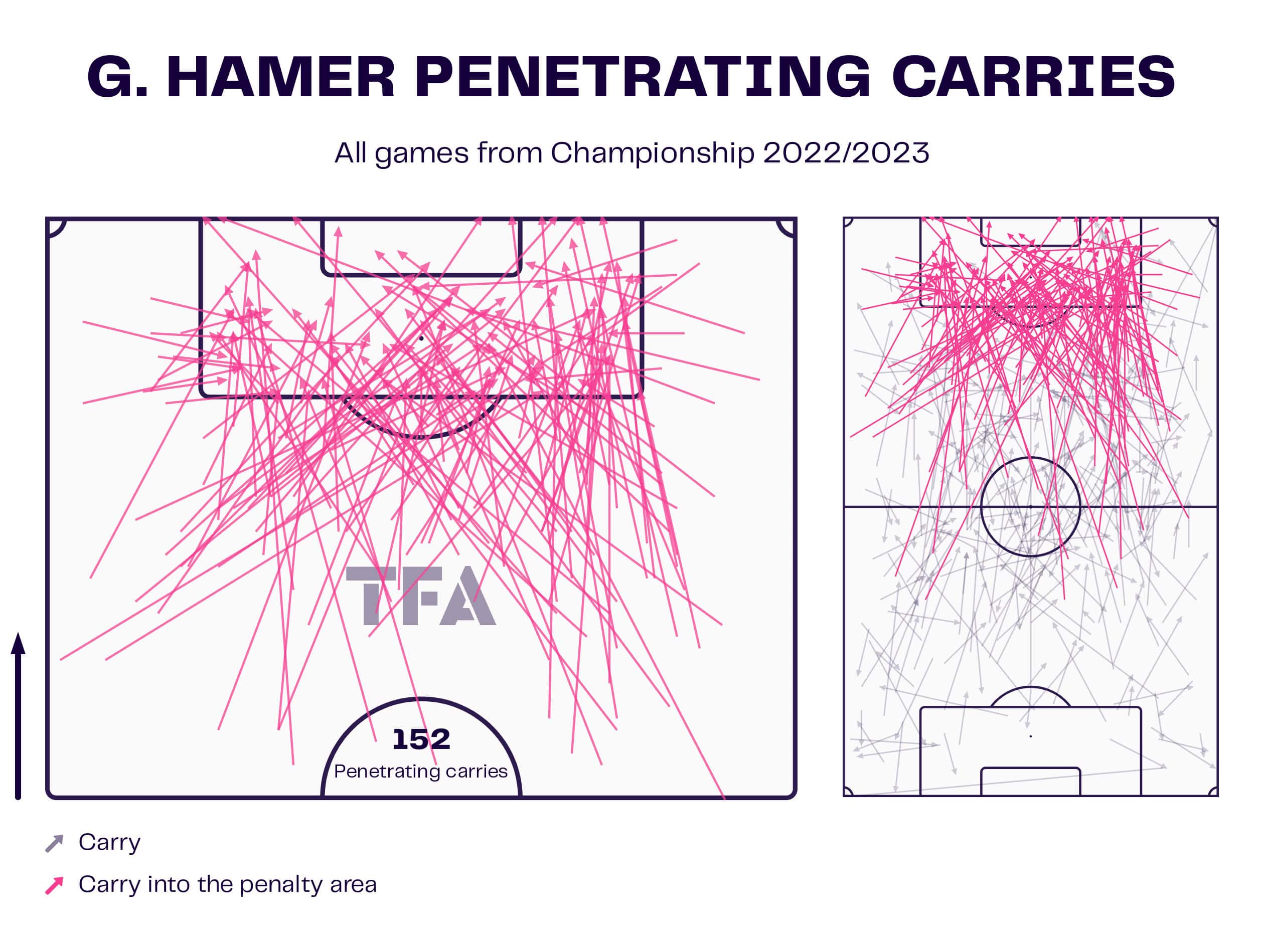 He leads the team in progressive passes with an impressive tally of 279 which means he advances the ball in a forward direction. Also, Hamer’s agility and determination are evident with his 152 penetrating carries, as the below graphic shows.