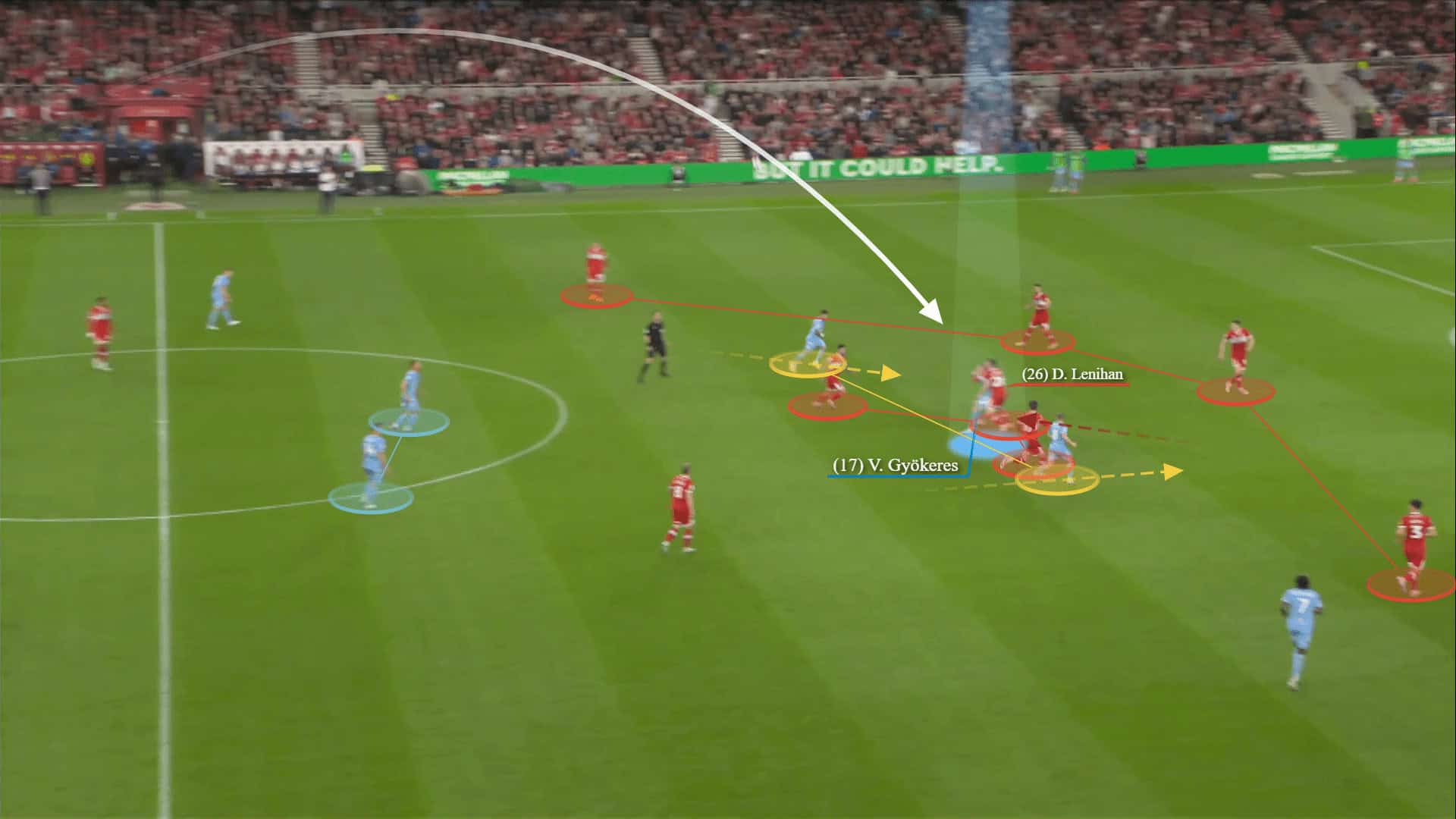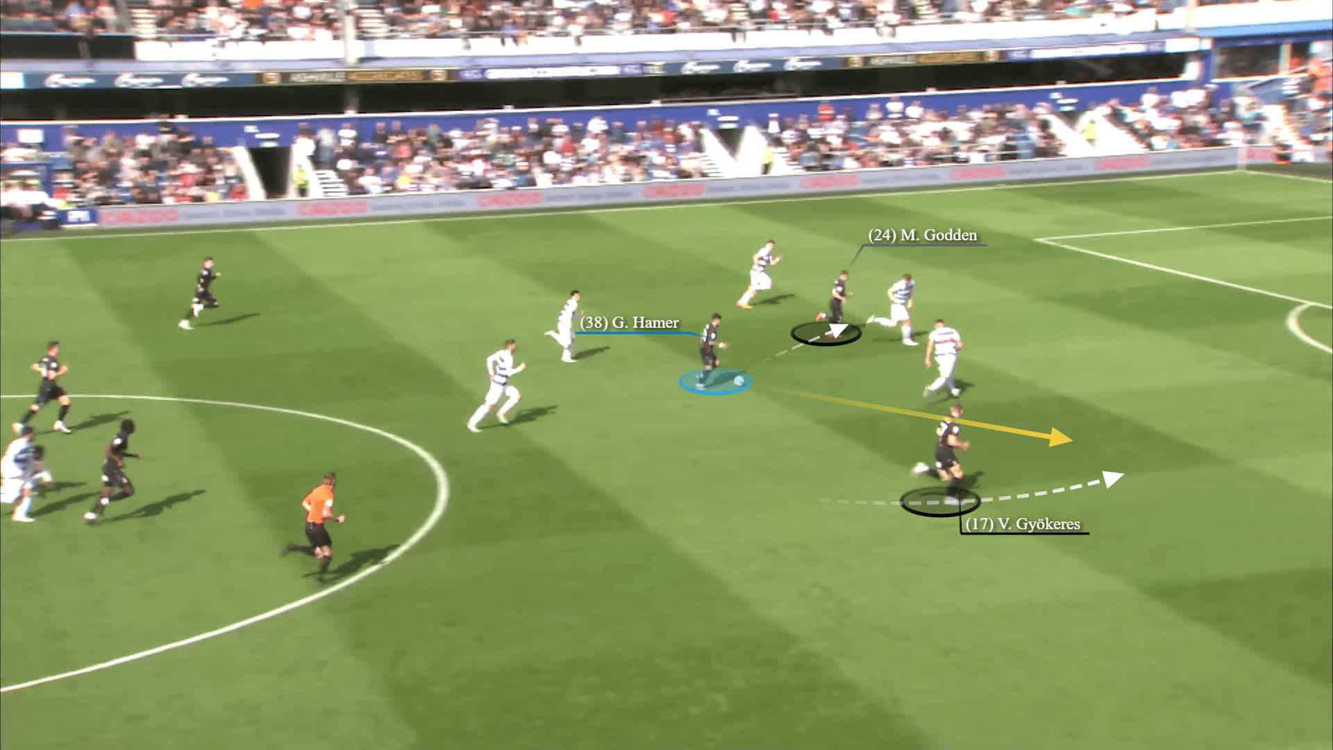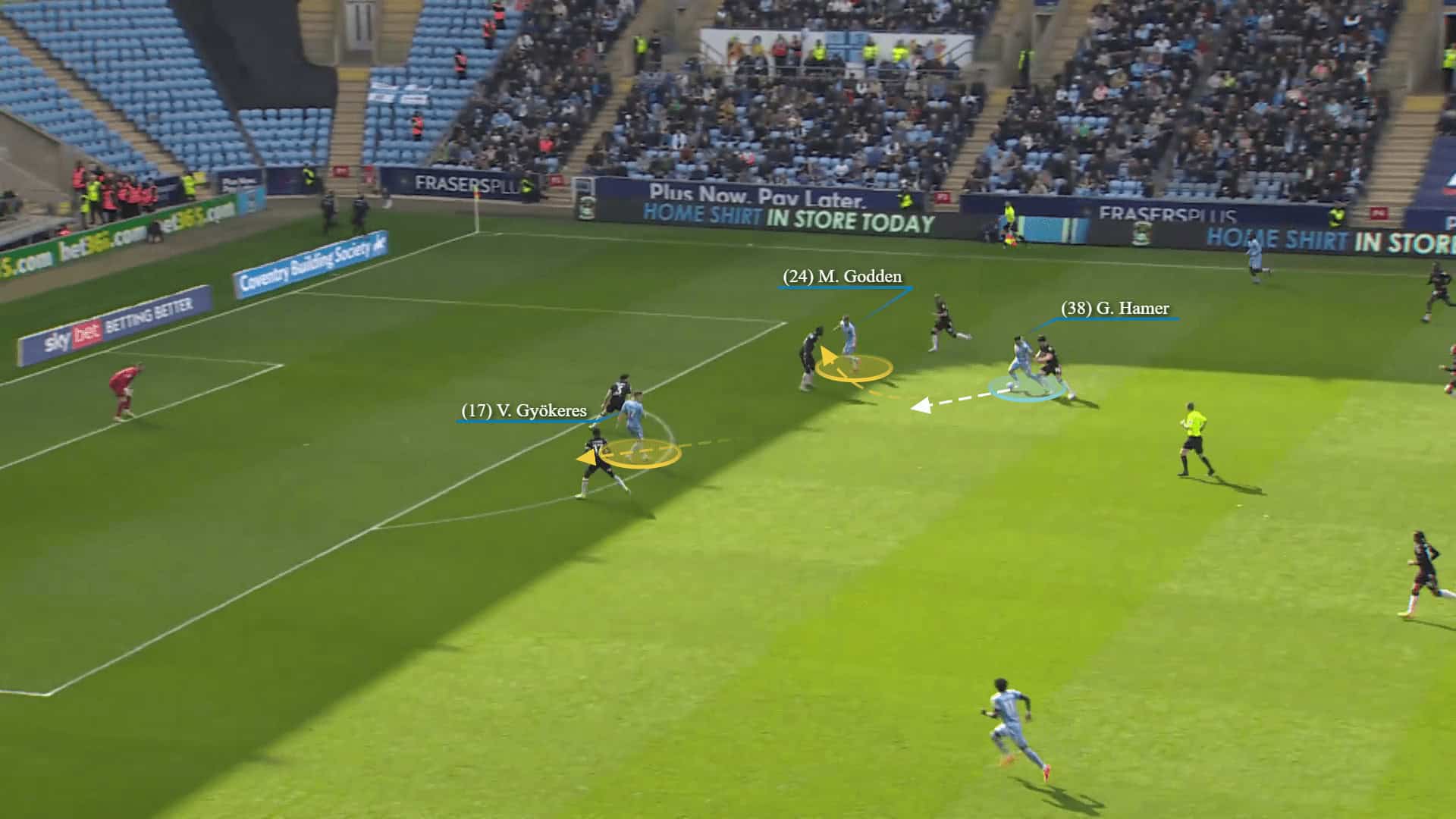 Godden began to pull the defender out while Gyökeres attacked in-to-out to open his body to receive.