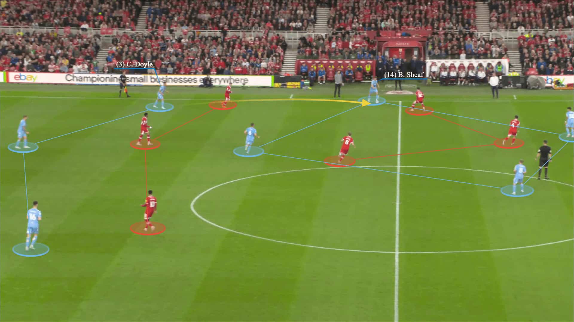 Coventry maintain a 3-2-4-1 structure in possession, utilising a 3-2 base, a box-midfield and stretching the width of the pitch by the wingbacks while their striker, Viktor Gyökeres, pins the opposition’s defensive line. The 3-2-4-1 gives them a static positional spread, making the vertical play easier.