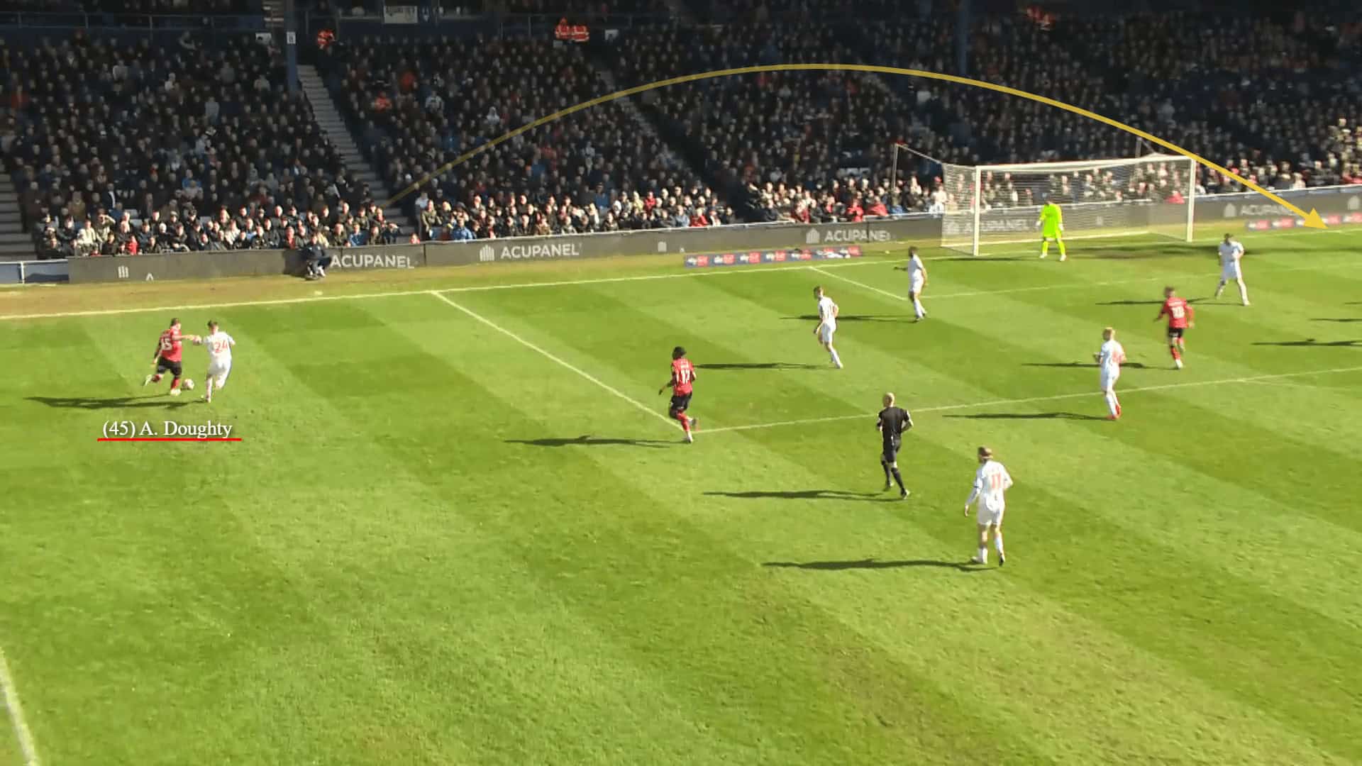 During the match against Blackpool, when Doughty received the ball on the left side, instead of cutting inside, he made a decisive vertical run, while the opposing attackers overloaded the penalty area waiting for the cross.