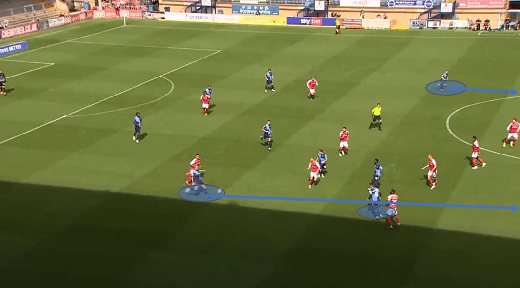 An example of Wycombe’s changed attacking approach, especially in transitions can be seen below. This attack is from their 1-0 opening day loss to Rotherham and it occurred only a minute into the game, and most definitely should have resulted in the opening goal for the Chairboys.