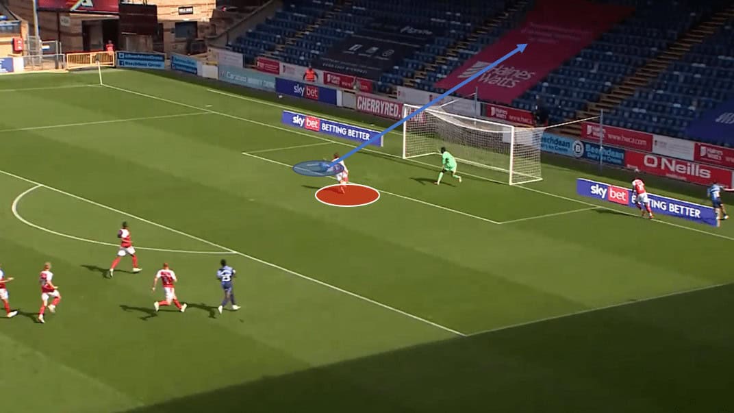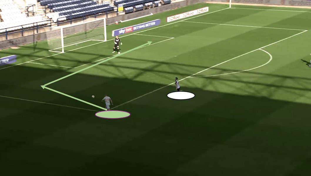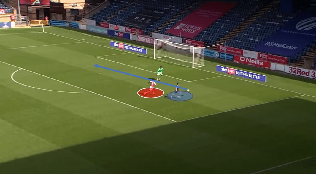 In this instance, Rotherham had just lost the ball from a header and right-back Wheeler was there to hit the ball long. However, the ball was not simply a hopeful long ball and was placed in the wide right channel and in behind the centre-back for the pacey Kashket to latch onto.
