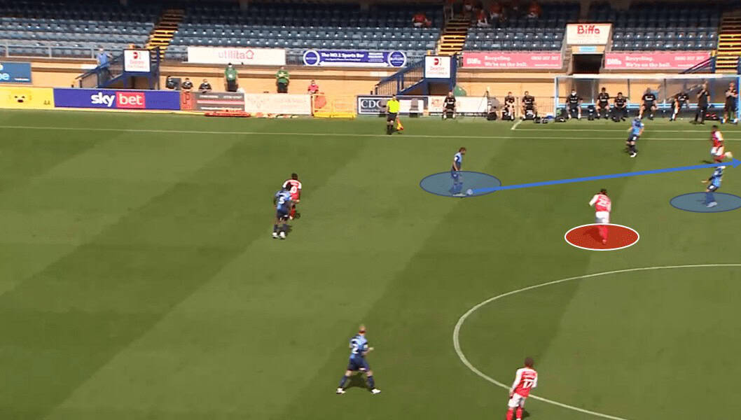 A further example of Wycombe utilising these channels from long balls can be seen in the frames below. After a failed through ball from a Rotherham midfielder, Charles found himself with the ball at his feet and Wycombe’s clear attacking strategy can be seen by his quick decision making. Charles’ first instinct was to look up and locate not only Kashket but also the wide channel where the space was for Wycombe to trigger a meaningful transition.