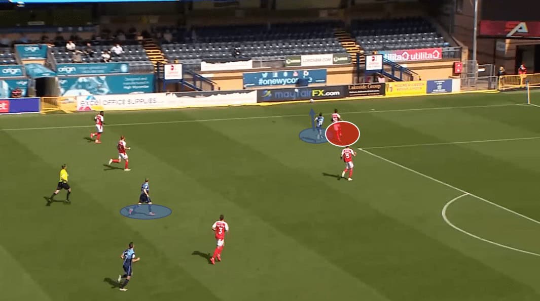 This complete loss of shape and defensive structure by each defender dragging themselves towards the danger was something that happened later in this game as well. In the next example, John Buckley has found himself surrounded by Wycombe players but is still allowed to play a through ball to Armstrong on the other side of the pitch.