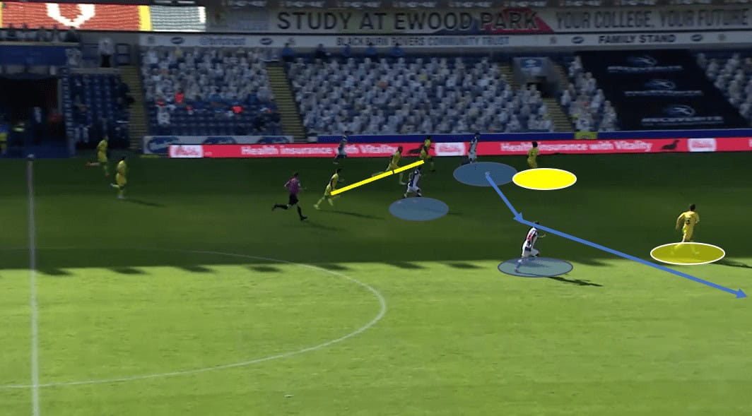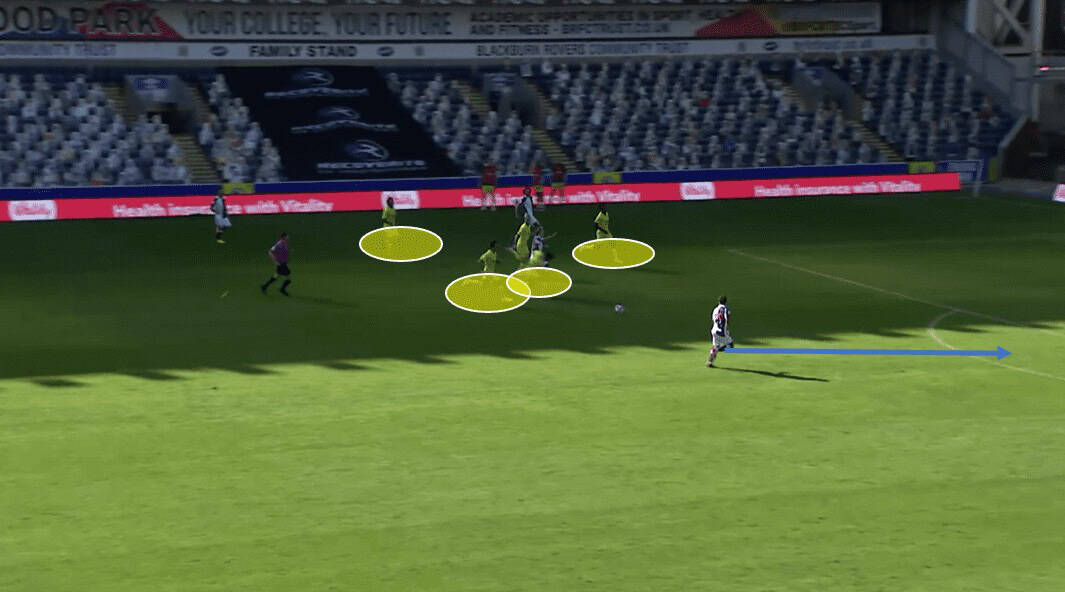 Armstrong is found in space against Stewart who is the one becoming isolated this time and this allows Armstrong to rampantly finish into the bottom corner. Yet again, Wycombe’s defenders rushed towards the ball in numbers without realising where the danger was. Attacking wide and attracting defensive numbers with the end goal to switch it instantly when the space appears, was a clear tactic from Blackburn that worked, and one that Swansea should try and replicate.