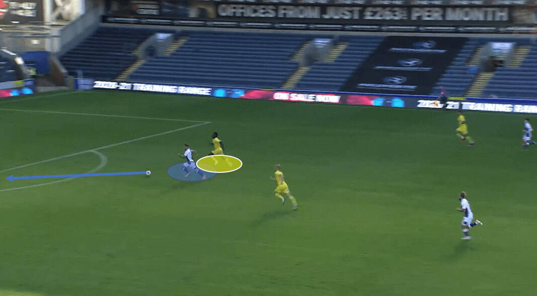 Although Kashket was able to beat the man and square it back to the incoming Horgan, he was unable to convert a golden opportunity, which can be seen in the frames below. This move showed that Wycombe could maintain a solid base of midfielders in central areas, while leaving Kashket up front on his own. Ultimately, this allowed Wycombe to get on the front foot from one long ball, which is something that would have surprised Rotherham, given that Wycombe predominately played with a hold up striker throughout last season. Ainsworth will know that his men must be more clinical in front of goal, especially against a team like Swansea. The chance shown in the frames below had an xG of 0.69, and in this game, they had an overall xG of 2.15, so chance creation for Wycombe doesn’t seem to be a huge problem just yet and will be something they look to continue on Saturday.