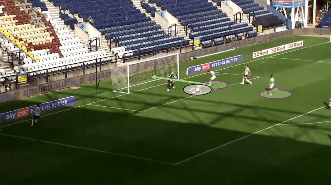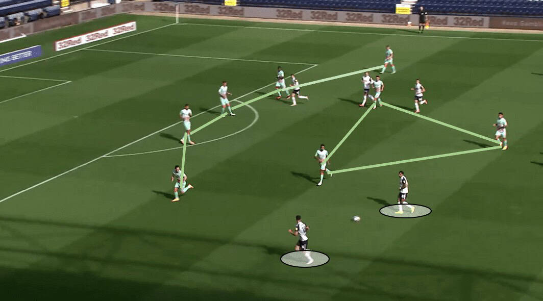 The importance of the full-backs will be even more crucial in this game as Swansea will have vast amounts of possession. Therefore, the full-backs will help provide the much-needed width to support the numbers in central areas and to help them create opportunities from an alternative source. Examples of Bidwell and Roberts proving to be key in Swansea’s build-up play were evident in the Preston game, and help us predict their role in their attacking setup on Saturday. This can be seen in the frame below. Swansea’s opening goal was the perfect example of the high and wide full-back system that Cooper advocates in his system. Given that Bidwell is predominately the higher full-back given his power and crossing ability, it is unsurprising that he was able to supply the assist for the goal.