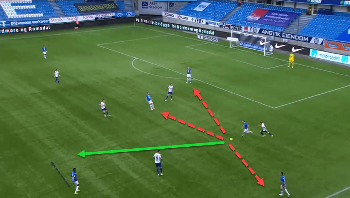 In case of a centre-back possession, the backline is expanded in the full width of the pitch. This way they can avoid losses in dangerous positions as the opposition has to cover greater areas in the final third. With the two centre-backs, Ivan Nasberg and Jonatan Nation staying wide, they provide extra space for Fredrik Jensen who drops deep to get the ball. He is the deep-lying playmaker for Valerenga whose primary duty is to connect the defence with the midfield.