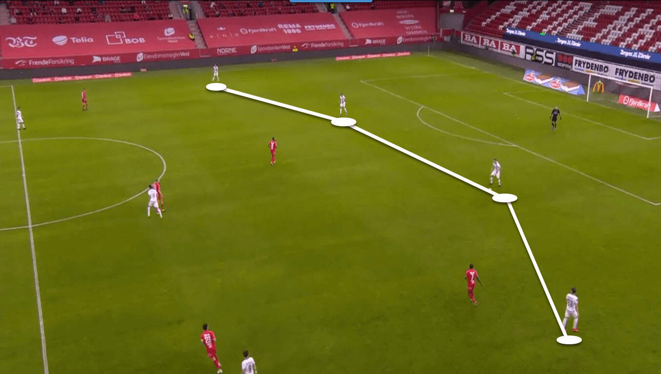 Dag Eliev Fagermo instructs his team to be direct and to play balls behind the opposition backline. This requires great awareness to invite the opponent to their own half and draw up player runs which create space in the midfield. With Jensen coming for the ball, he usually drags a midfielder out of place. The box-to-box midfielders occupy more advanced positions, easing the pressing passively. This way, Valerenga have a reduced opportunity to play out of the back. When the full-backs receive the ball, they have two options. Either they launch a long ball towards the striker or they wait for the wingers to come short.