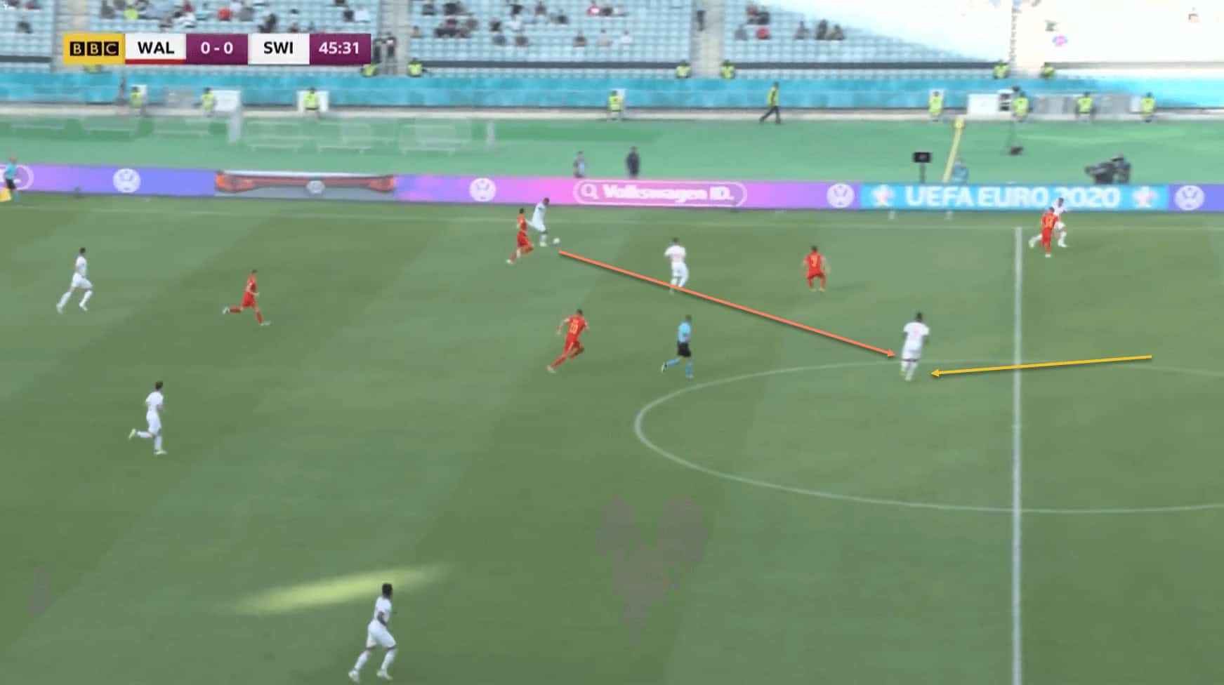 This partnership worked perfectly in the build-up to Switzerland’s opening goal against Wales. Manuel Akanji was allowed to step out of defence, and he played a pass through the lines to Seferović, who dropped off to receive, dragging Chris Mepham with him. Seferović played a first-time layoff to Embolo, who was able to spin into the vacated space behind the Wales defensive line, and ran through to get a shot on goal that Danny Ward saved, with Embolo then scoring from the resulting corner.