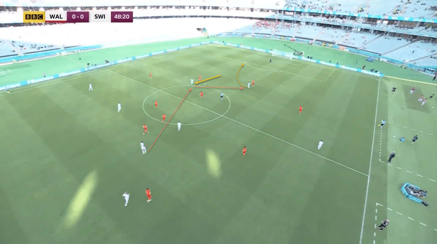 …and with Seferović forcing the Wales defenders to stay deeper, he can drive forward, and has the option of playing in Kevin Mbabu on the right as well, since Ben Davies has also been drawn narrow due to Seferović’s positioning.