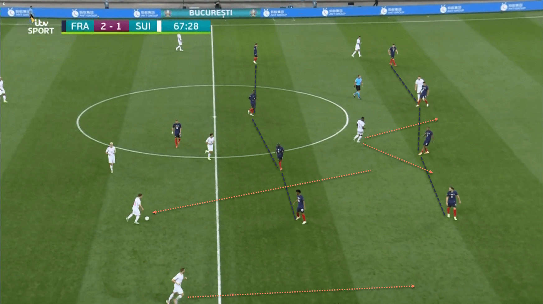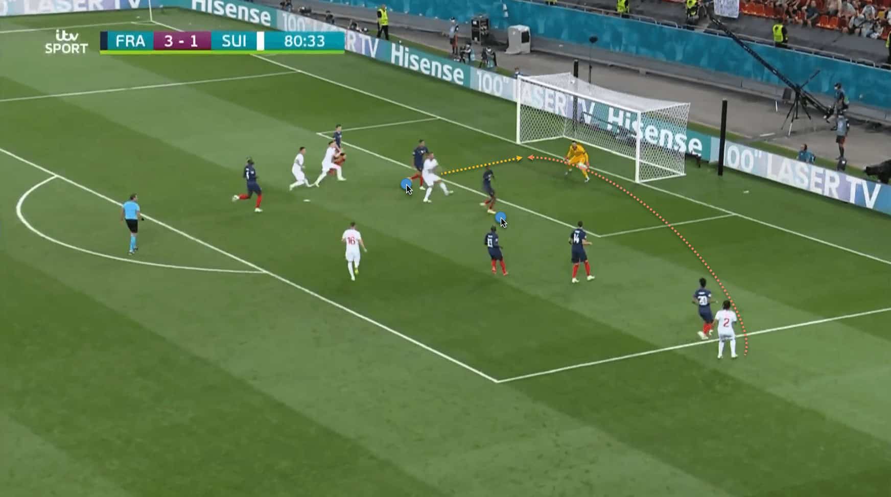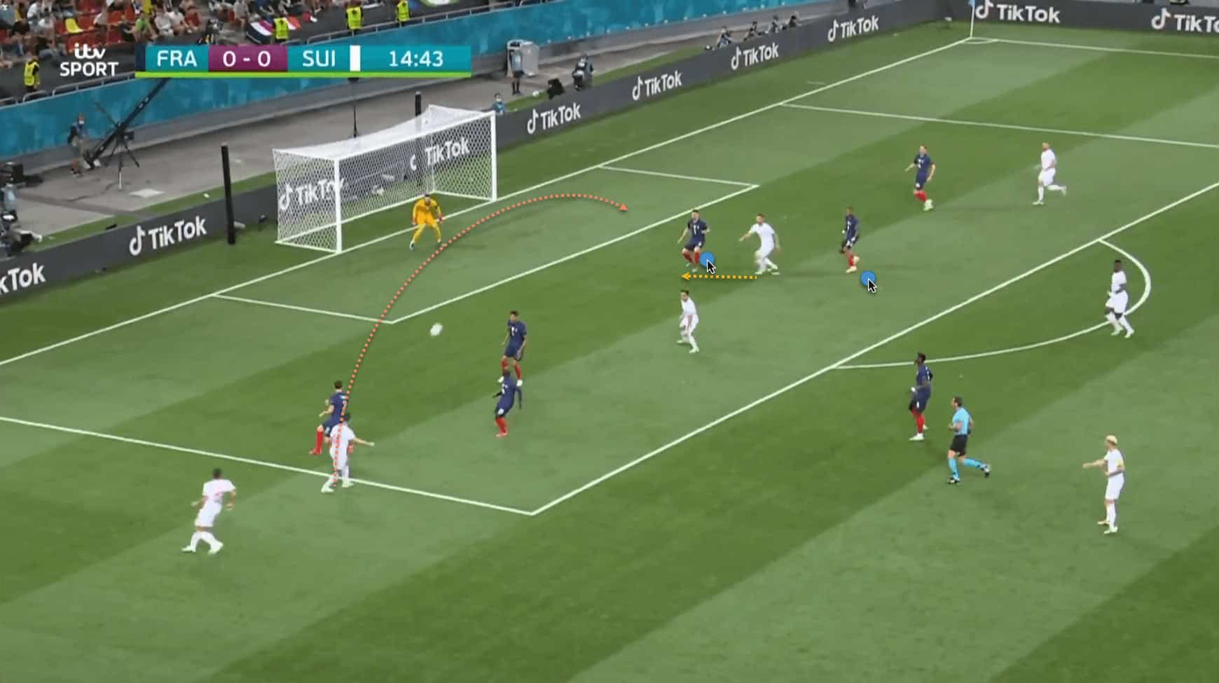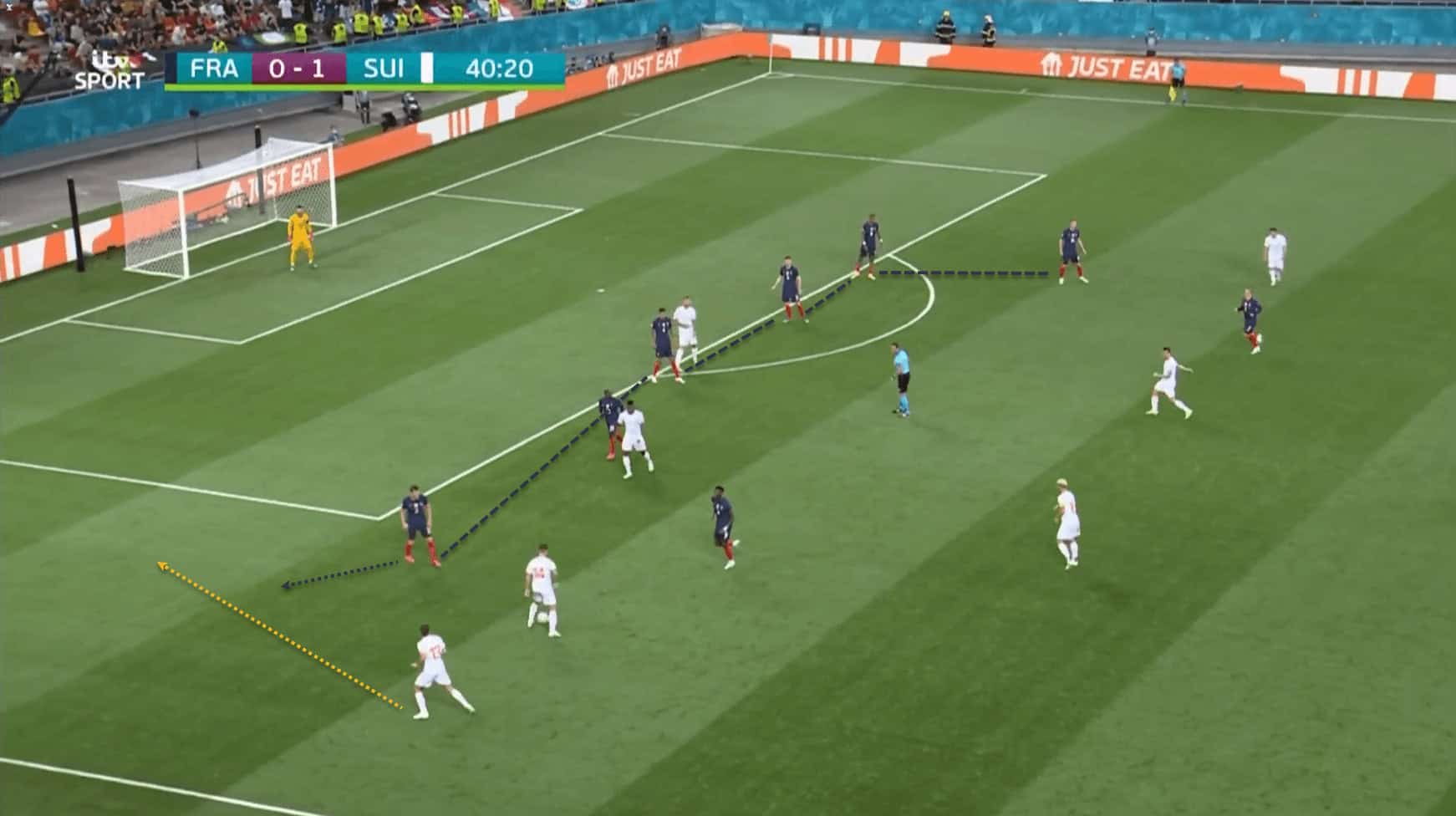 The ball is worked out to the Swiss left-back and back again, and this creates a huge gap for Embolo to run into, with Xhaka able to find him in the box with a relatively simple pass. Pavard is left scrambling here since he was initially drawn out to cover Rodríguez’s run and is thus in a wider position when the ball is played back centrally. Switzerland will try to create similar situations down their left flank again versus Spain, and it will be down to whoever plays on the right wing (most likely to be Ferran Torres) to track back and ensure that César Azpilicueta is not caught out in a similar manner.