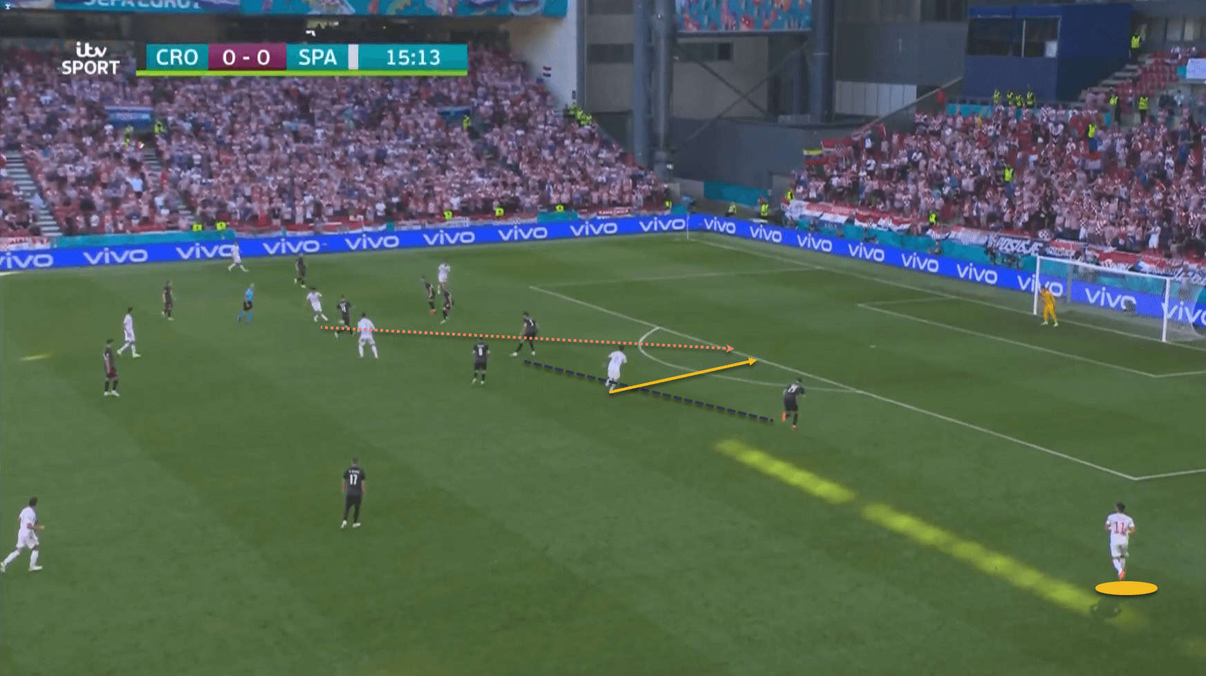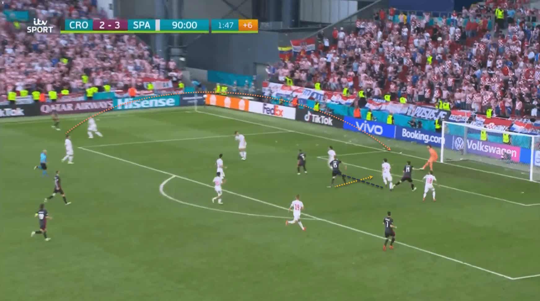This is a good example of Spain’s use of width to stretch play. Note how Torres is extremely wide on the right – while he will not play a direct part in this move, his presence forces Joško Gvardiol to stay a little wider at left-back, which opens up the channel between him and Duje Ćaleta-Car. Álvaro Morata also drops off from the Croatian defensive line to try and drag a defender out. Laporte plays the ball to Busquets, who moves it on to Pedri…