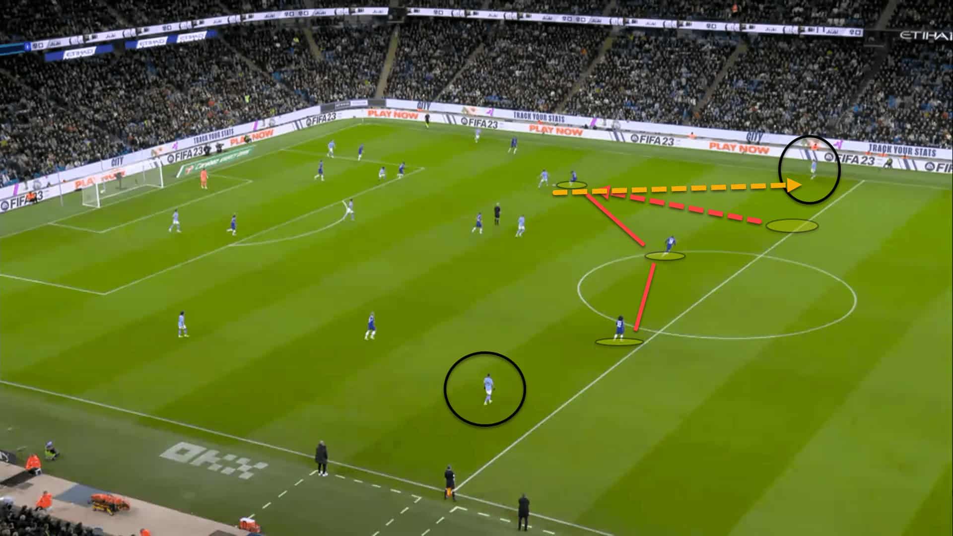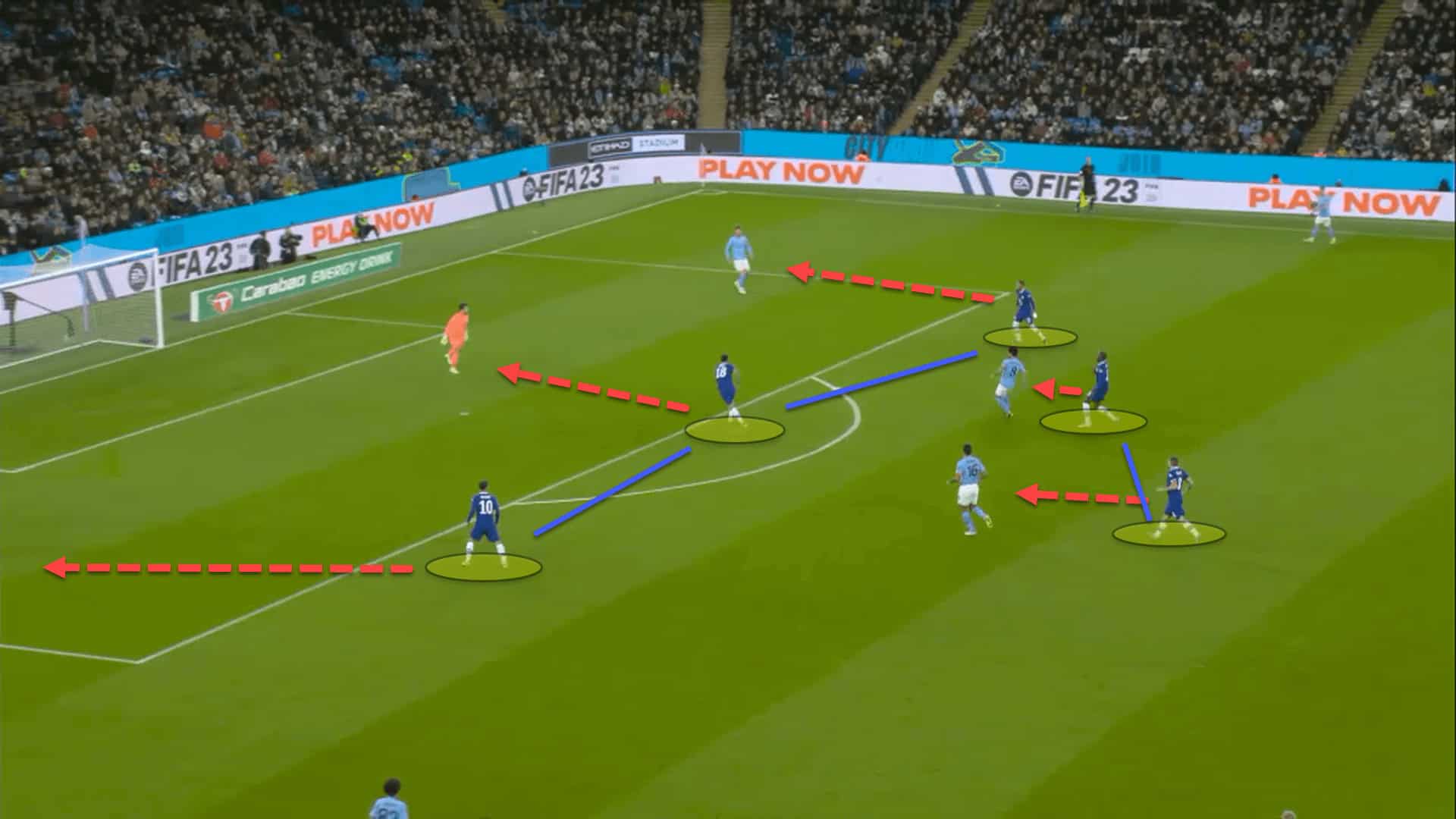 With Chalobah out of position, Grealish and Mahrez had a 2v2 situation against Kalidou Koulibaly and Marc Cucurella, stretching the two centre-backs. From there, City were able to create an excellent goalscoring opportunity which almost led to a goal.