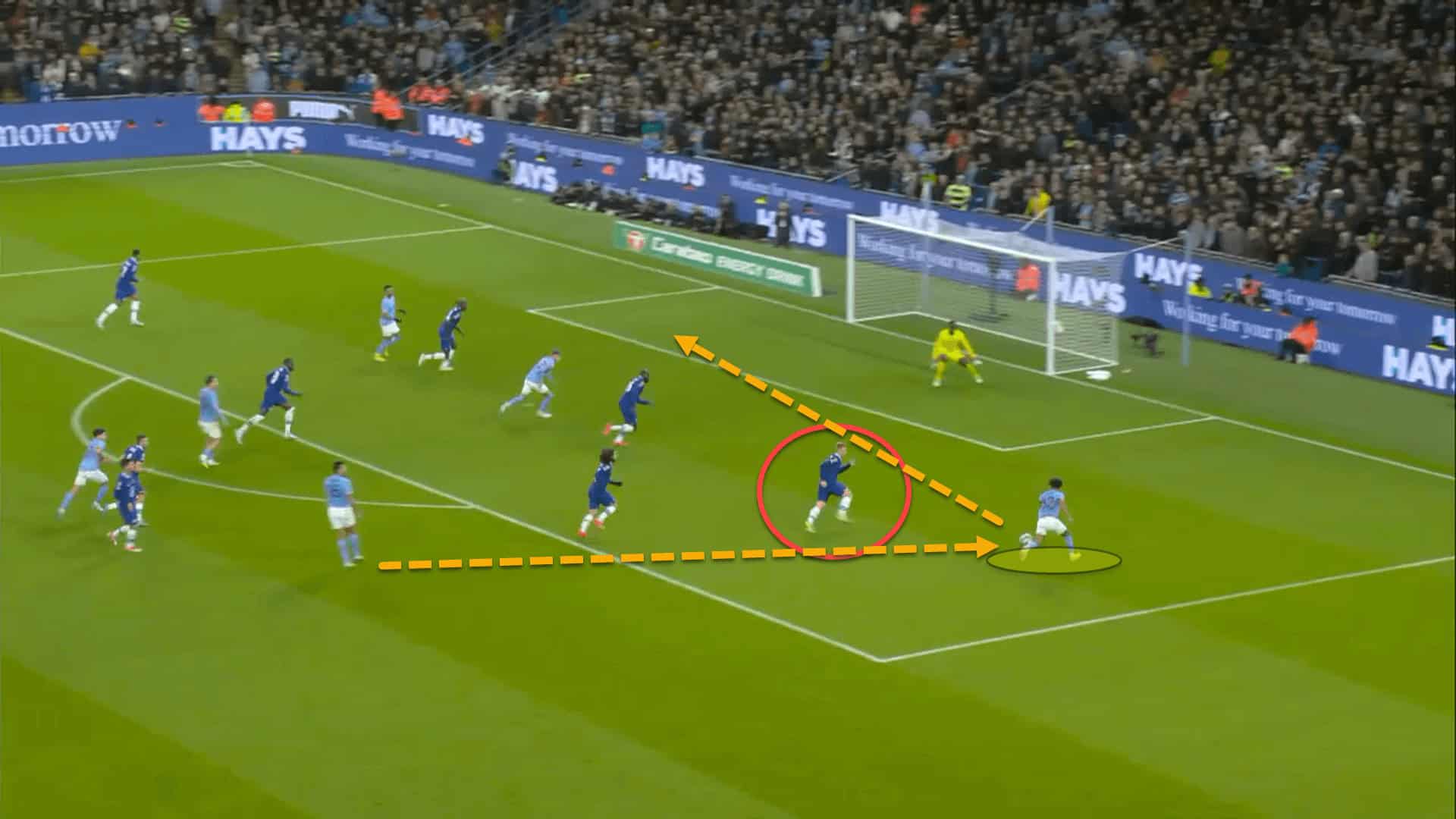In the Carabao Cup game back in November, City were able to create numerous chances from crosses and cutbacks in the halfspaces because Chelsea’s midfield was not plugging gaps well enough.