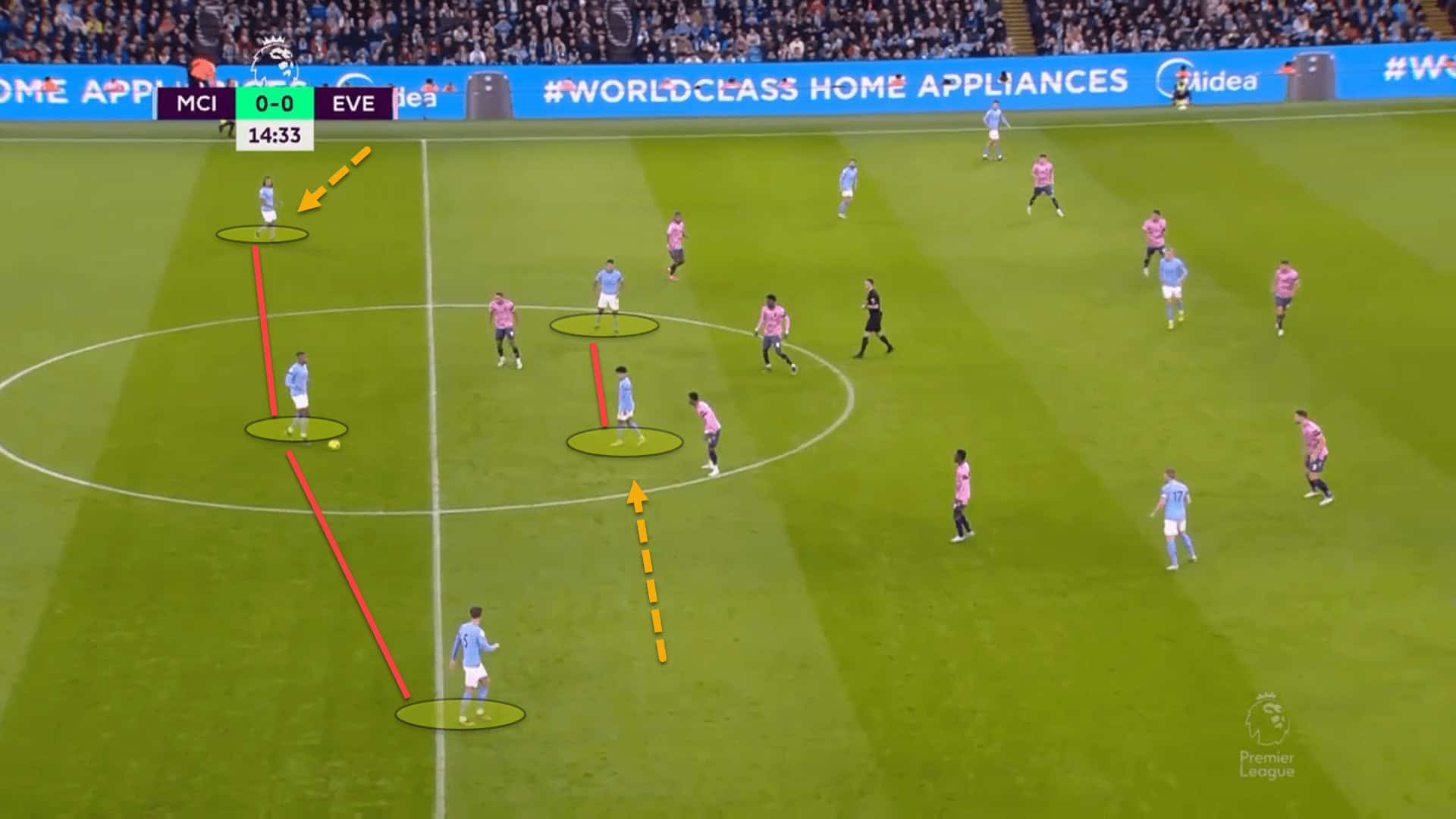 City love to create separations between the opposition’s nearest centre-back and wingback/fullback. This allows their number ‘8s’, or advanced central midfielders as they are often called, to make underlapping runs in the halfspaces to get into excellent crossing positions.