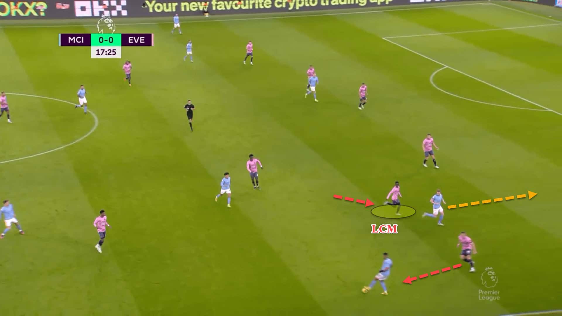 Instead, Everton dropped off into a 5-3-2 mid-to-low block and remained compact in the middle of the pitch, denying City the opportunity to play to their star attackers between the lines.