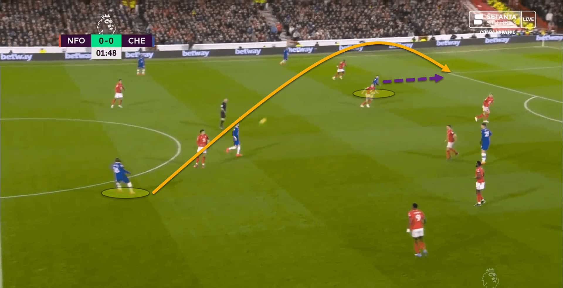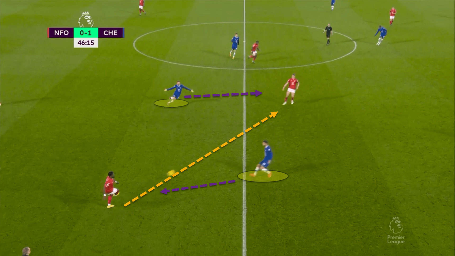 Here, Pulisic stepped forward to press Serge Aurier, who was in possession, without angling his run to block off the passing lane on the inside. Mason Mount is visibly annoyed at his colleague for such a poor lapse of concentration as Aurier simply played it inside and Forest could turn and play forward.