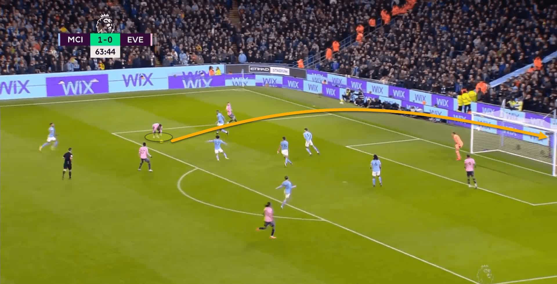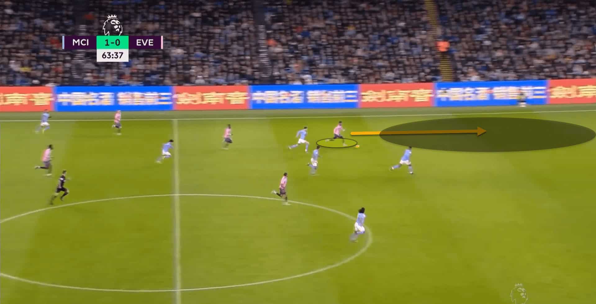 On the flip side, if the central counterpressing is broken, opponents can play down the sides where City’s weaknesses are. Everton scored their only goal of the game, after registering a total xG of just 0.08, by winning the ball back and transitioning down the left flank with Demarai Gray.