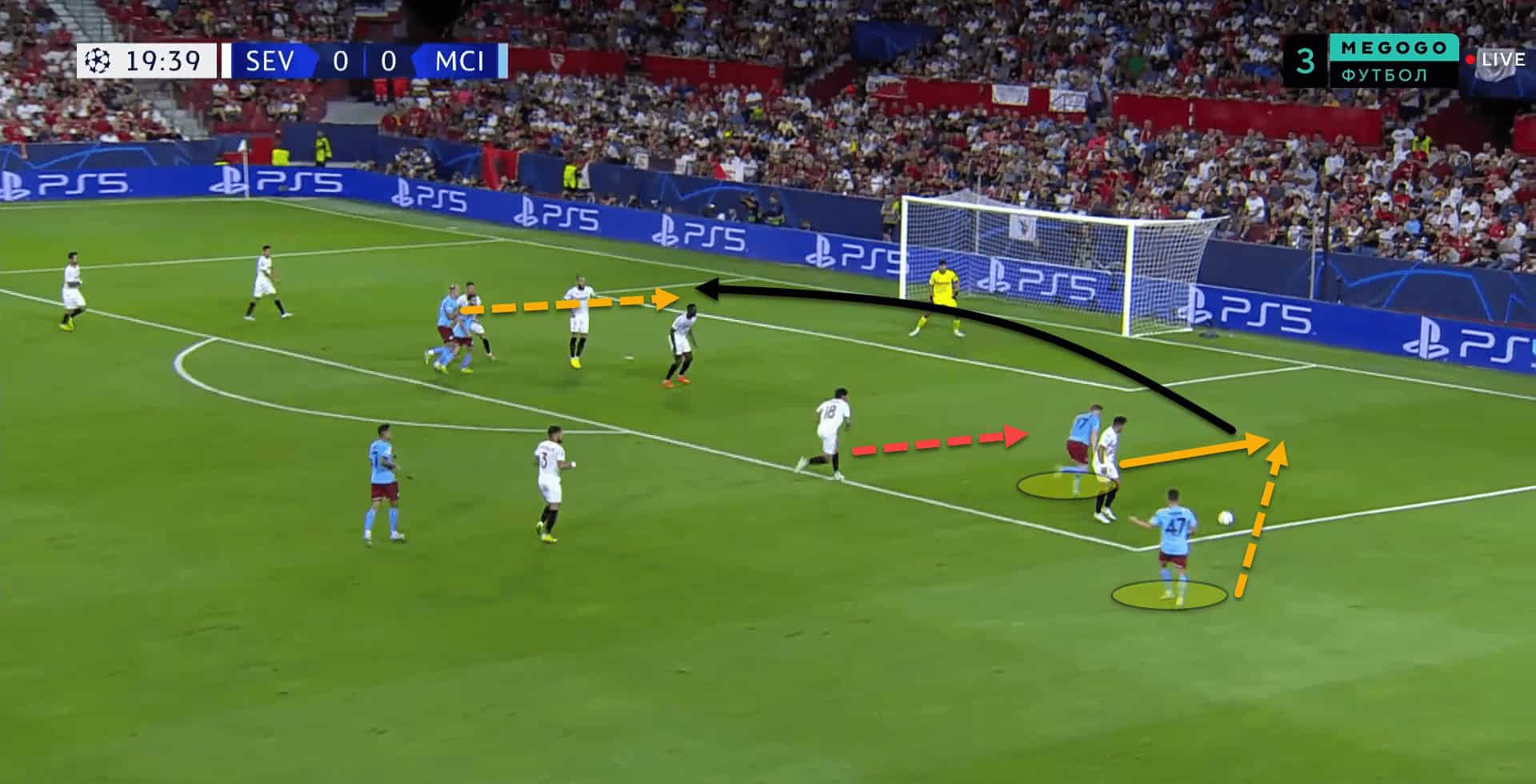 Here, City have created a separation between Sevilla’s left-back and left centre-back. Spotting the gap, de Bruyne makes a darting run into the space and receives the ball in behind from Foden.
