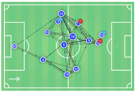 For City, their two-striker structure during a match comes at the expense of a right-winger. To make up for this, Beckie gets forward from her right-back position and is aided by Scott, who often drifts into more advanced areas on this right side from her midfield position. In some circumstances, City’s shape can resemble a 4-4-2 when Scott moves out here. Both of City’s strikers are poachers. As you can see in the pass map below against Birmingham City Women, the passing lines between the two up front and the rest of the side are rather weak. They often do not get involved in any of the build-up, but instead, look to get on the end of these attacking moves in the box.
