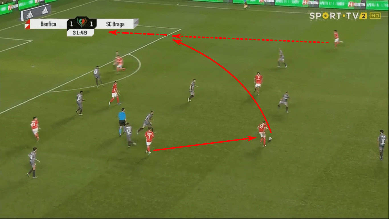 In this instance, Benfica has just completed a switch of play. You can see Grimaldo isolated on the left-wing with runners arriving in support. Deciding against the wide route, Grimaldo let his teammates continue their runs deep into the half-space and wing.