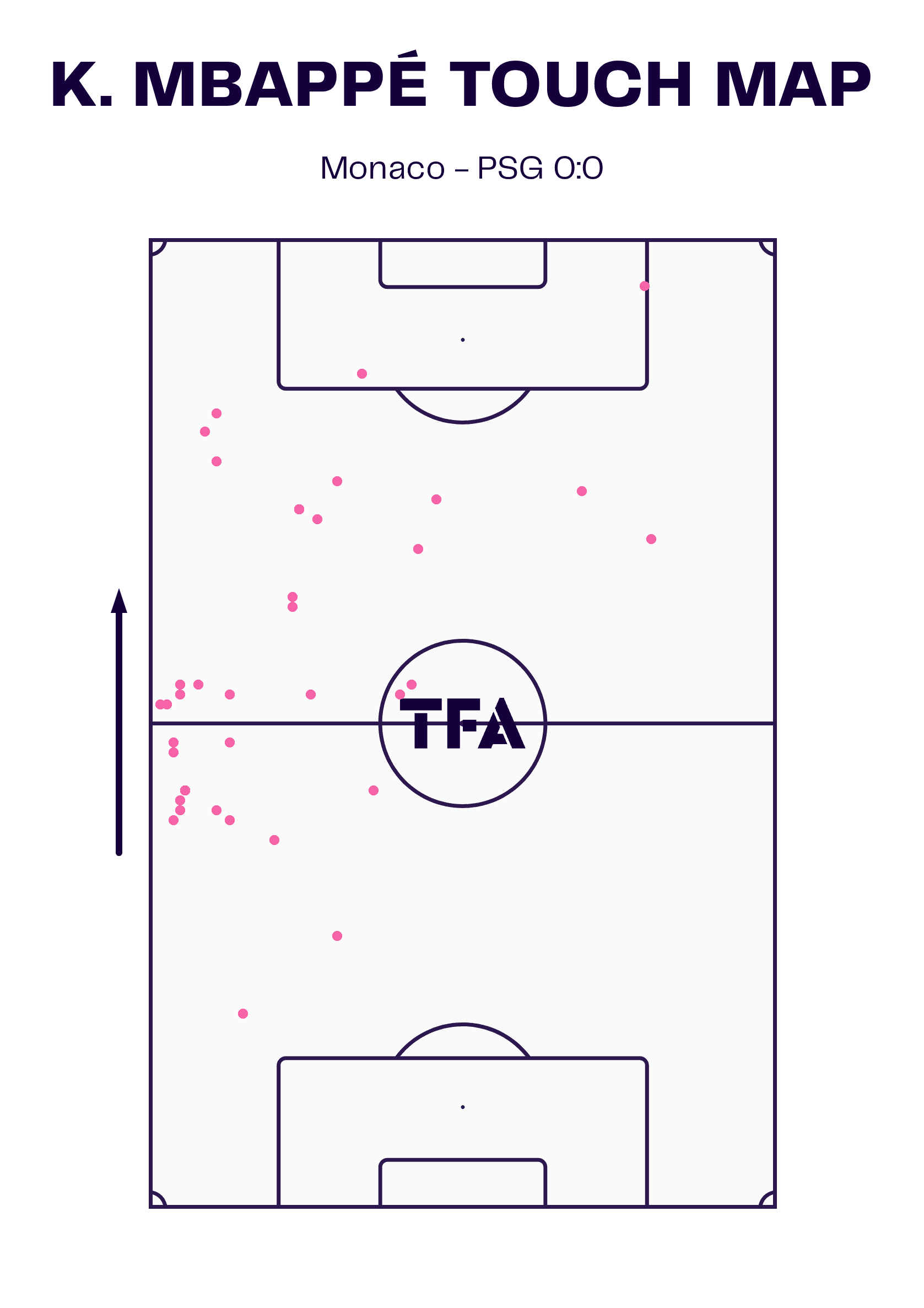 There were plenty of examples of Monaco dealing well with the threat of Mbappé throughout this game — they didn’t provide a lot of examples of how to defend against him 1v1 or as a dribbler rather, they showed some brilliant demonstrations of how to control him and prevent his involvement as much as possible, limiting his touches in advanced areas significantly, as figure 3 below displays.