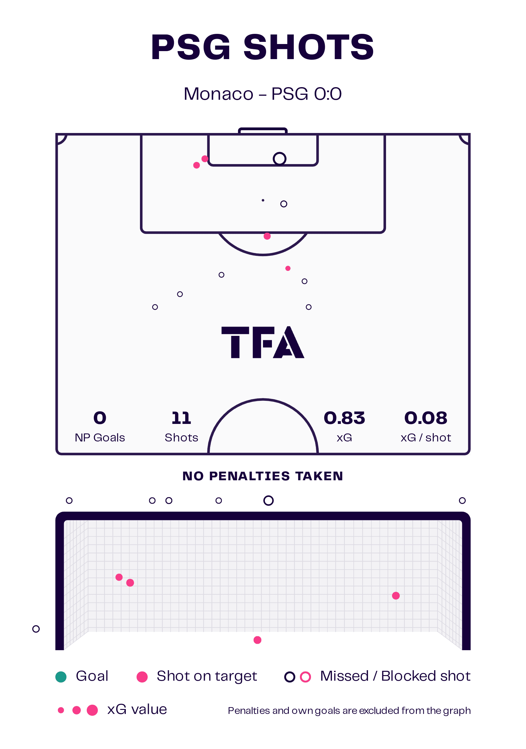 The result of this hard work and preparation was the PSG shot map you see above — just 11 shots, well below their Ligue 1 season average of 14.46 per 90, and an xG of 0.83, also significantly lower than their 2023/24 average in the league of 2.02 per 90.