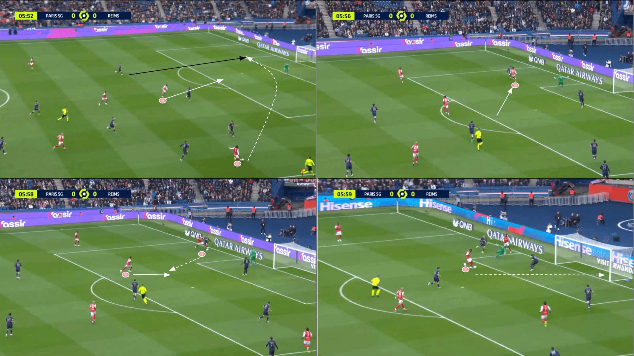 By doing so, they negated the PSG players’ 1v1 ability, as they always had several Reims bodies to deal with when receiving in such situations.