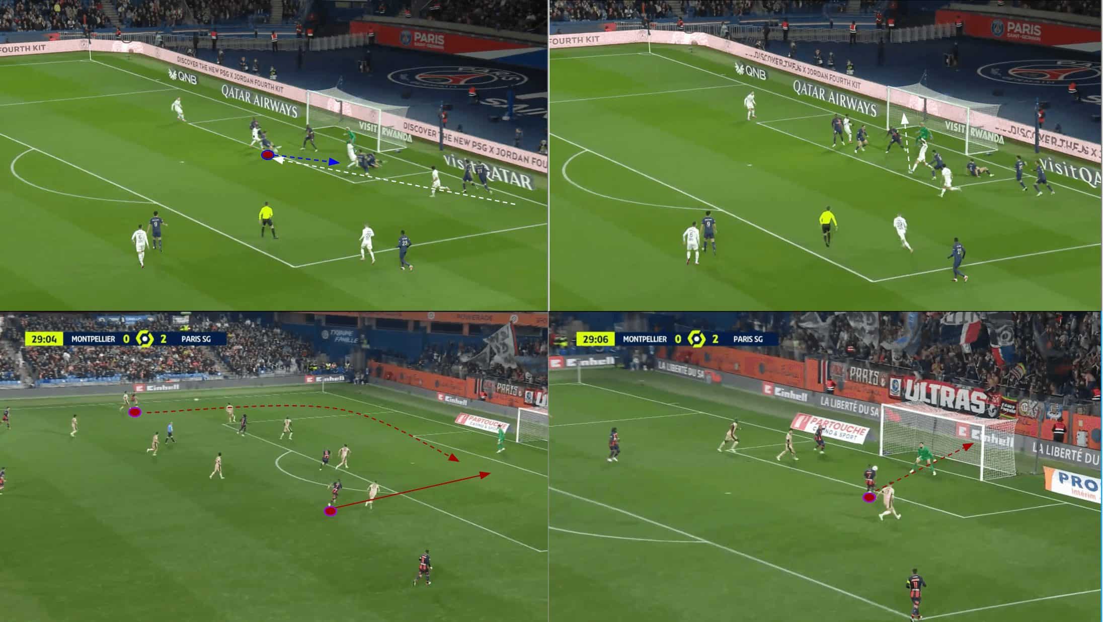 In the bottom two images, Montpellier sends a cross in, and Lucas Hernández fails to track the runner, who ends up with a free shot from point-blank range. At times this season, we’ve seen some poor marking in PSG’s backline also contribute to vulnerability from crosses and early balls forward, as we see in this case — another issue for Marseille to try and take advantage of in Le Classique.