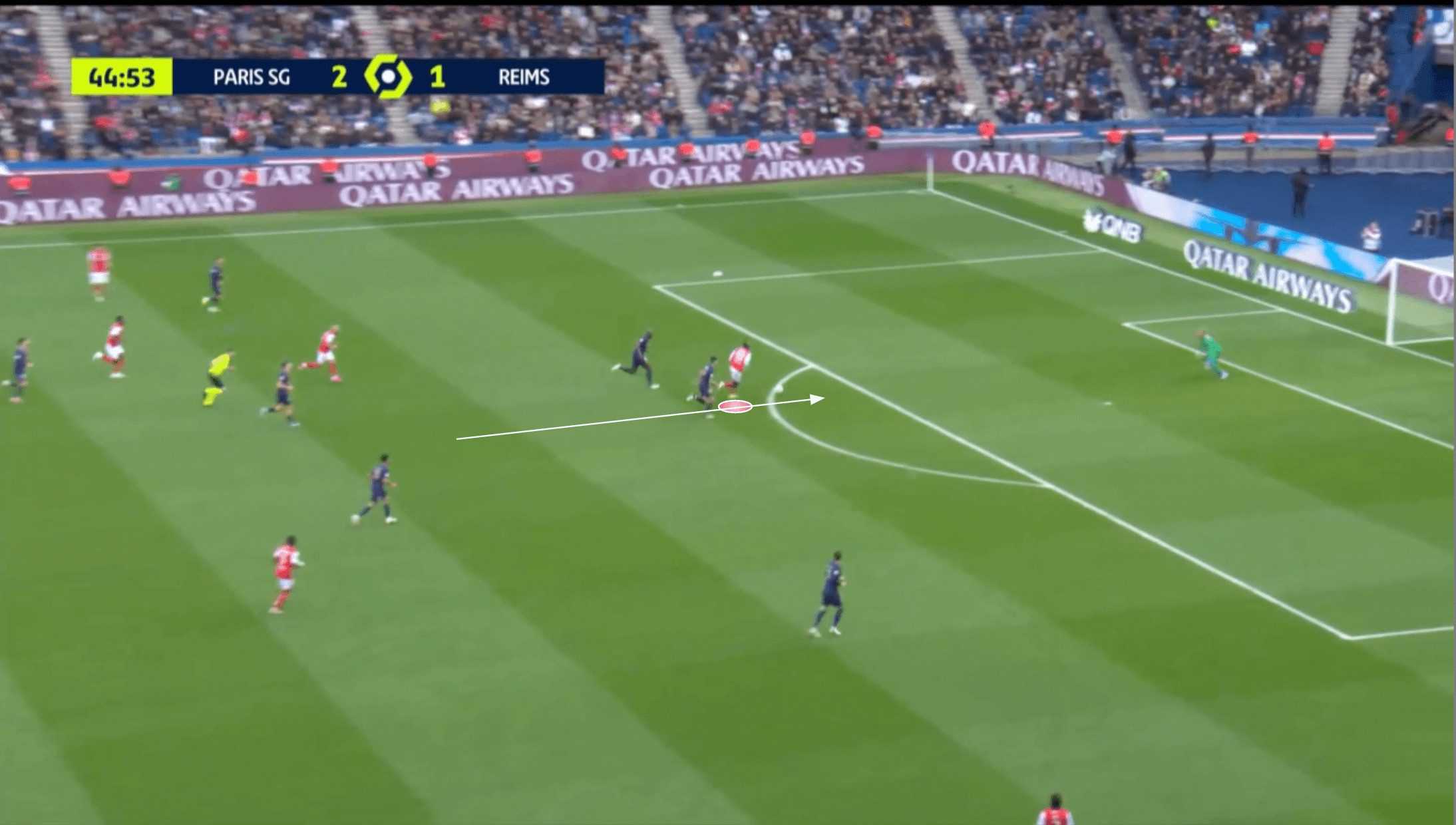 Beraldo should’ve had a side-on body position to deal with this ball in behind but wasn’t prepared. The result was that it took him too long to turn. He lost his man, and Diakité carried it towards Keylor Navas in goal, slotting it past him to tie Reims level at 2-2.