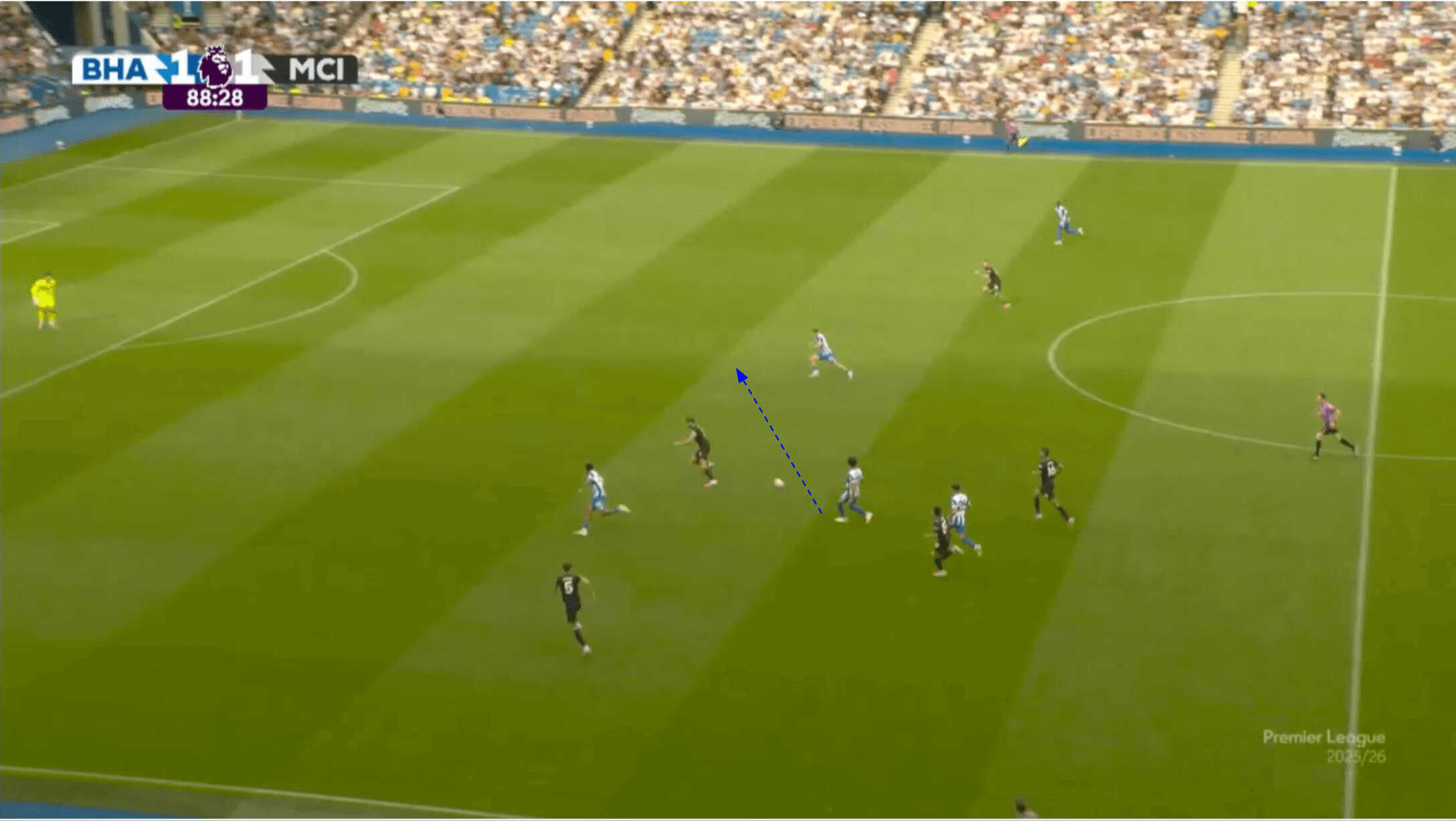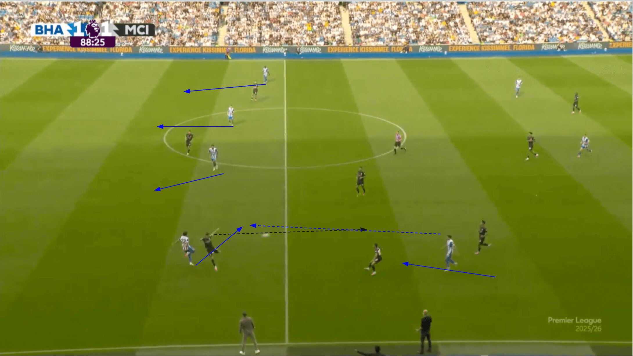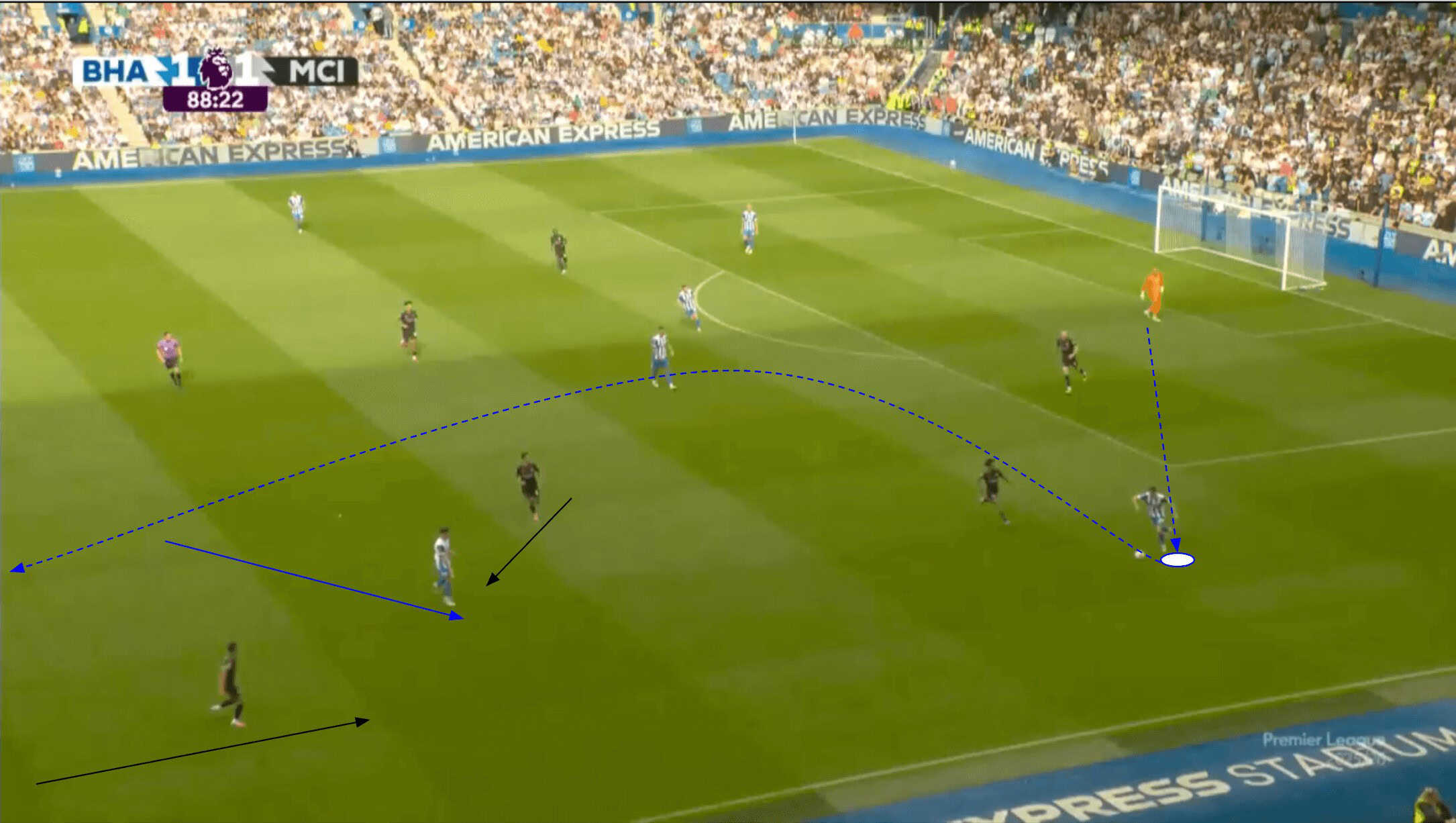 This enables Brighton to overload City’s backline and charge towards goal to score the winner.