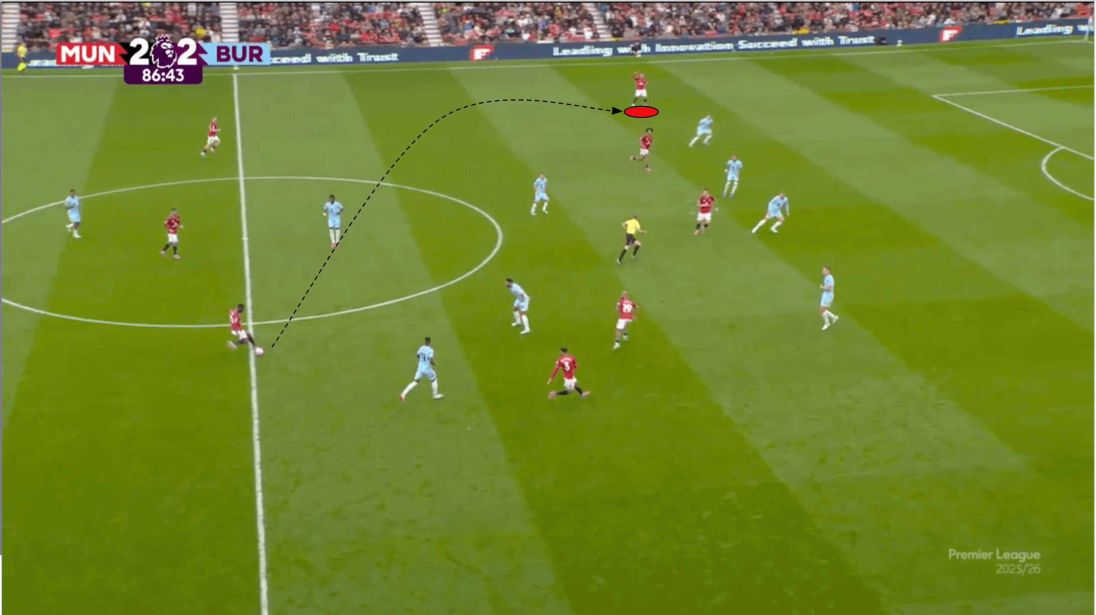 He has the passing range and vision to put the ball on Šeško’s head, creating an opportunity for the forward to hold the ball up, knock it down for a teammate to exploit space around the City pivot or knock it on for a runner moving in behind, as well as send the ball into space for runners like Dalot or Amad Diallo to chase or break lines and find the likes of Mbeumo or Cunha in the half-spaces which City may struggle to cover, especially in transition.