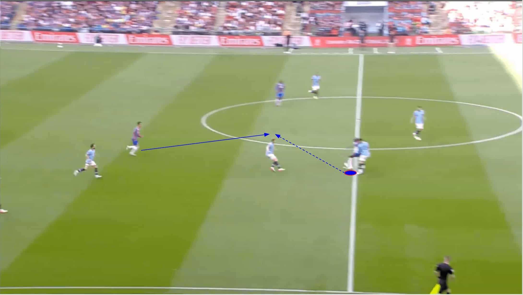 Palace ended up playing the ball through to runners attacking space and exposing City’s weakened backline to score what would be the only goal of the game.