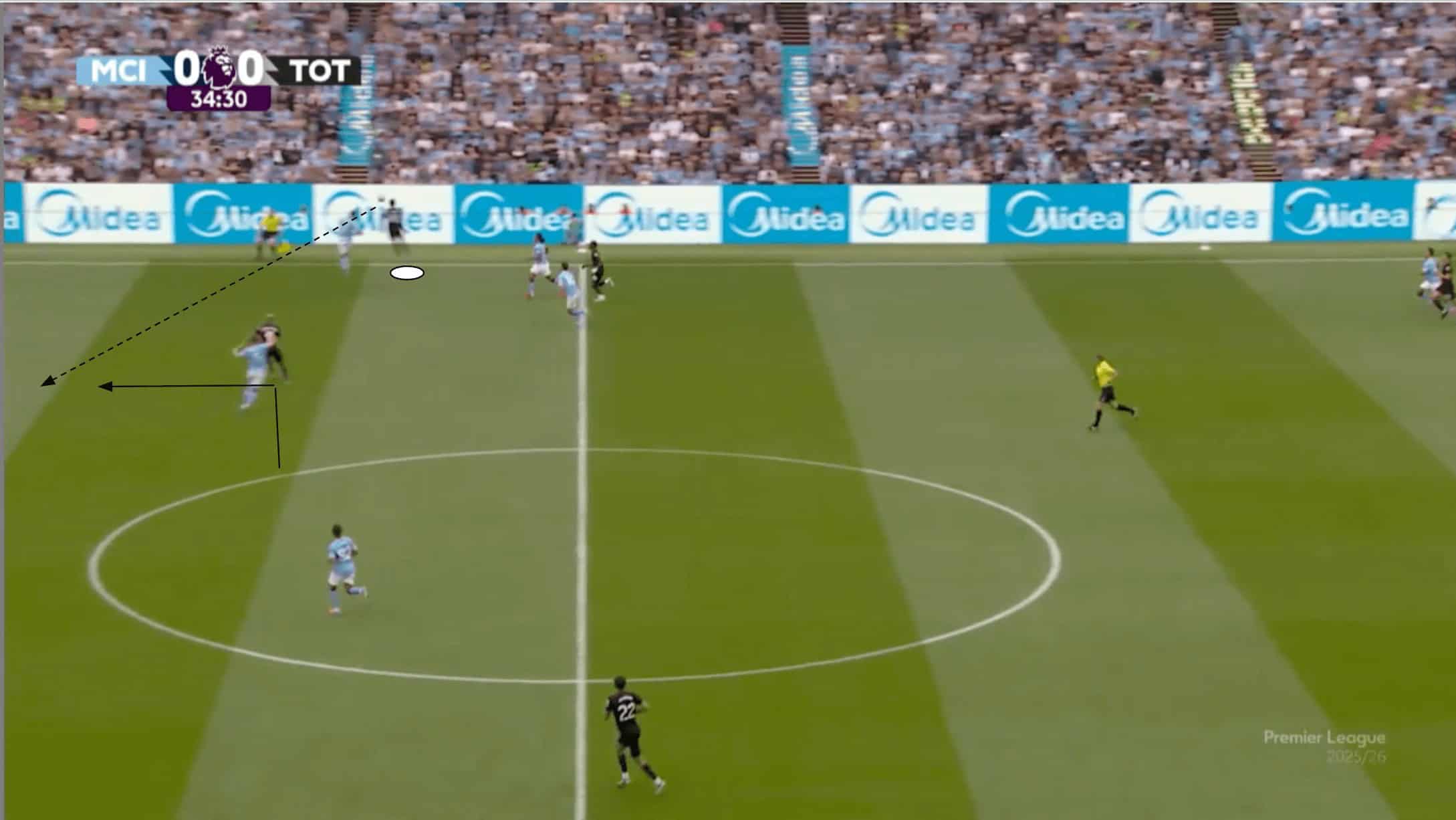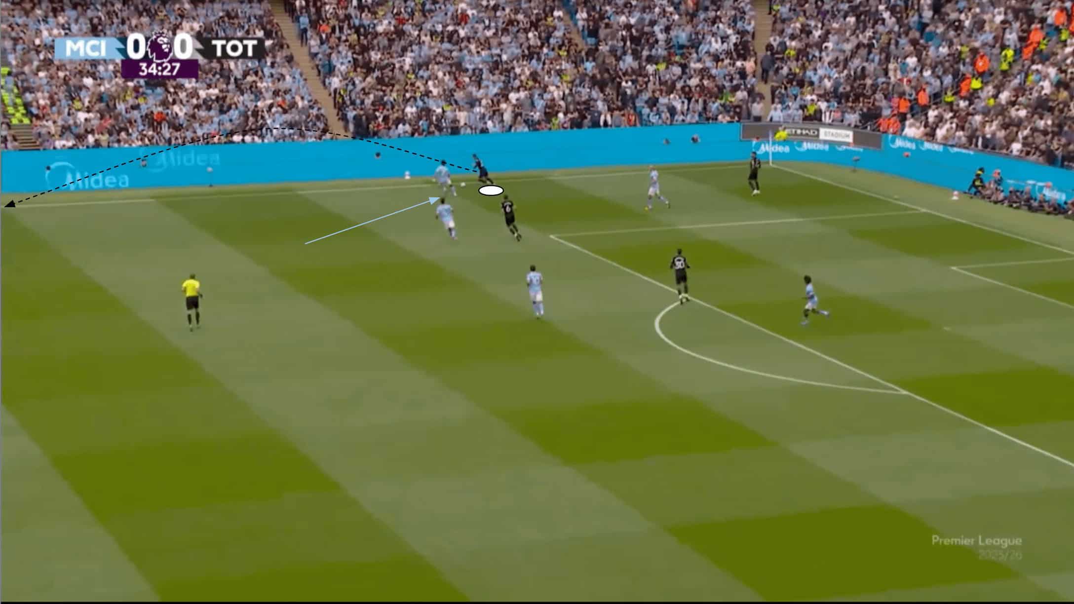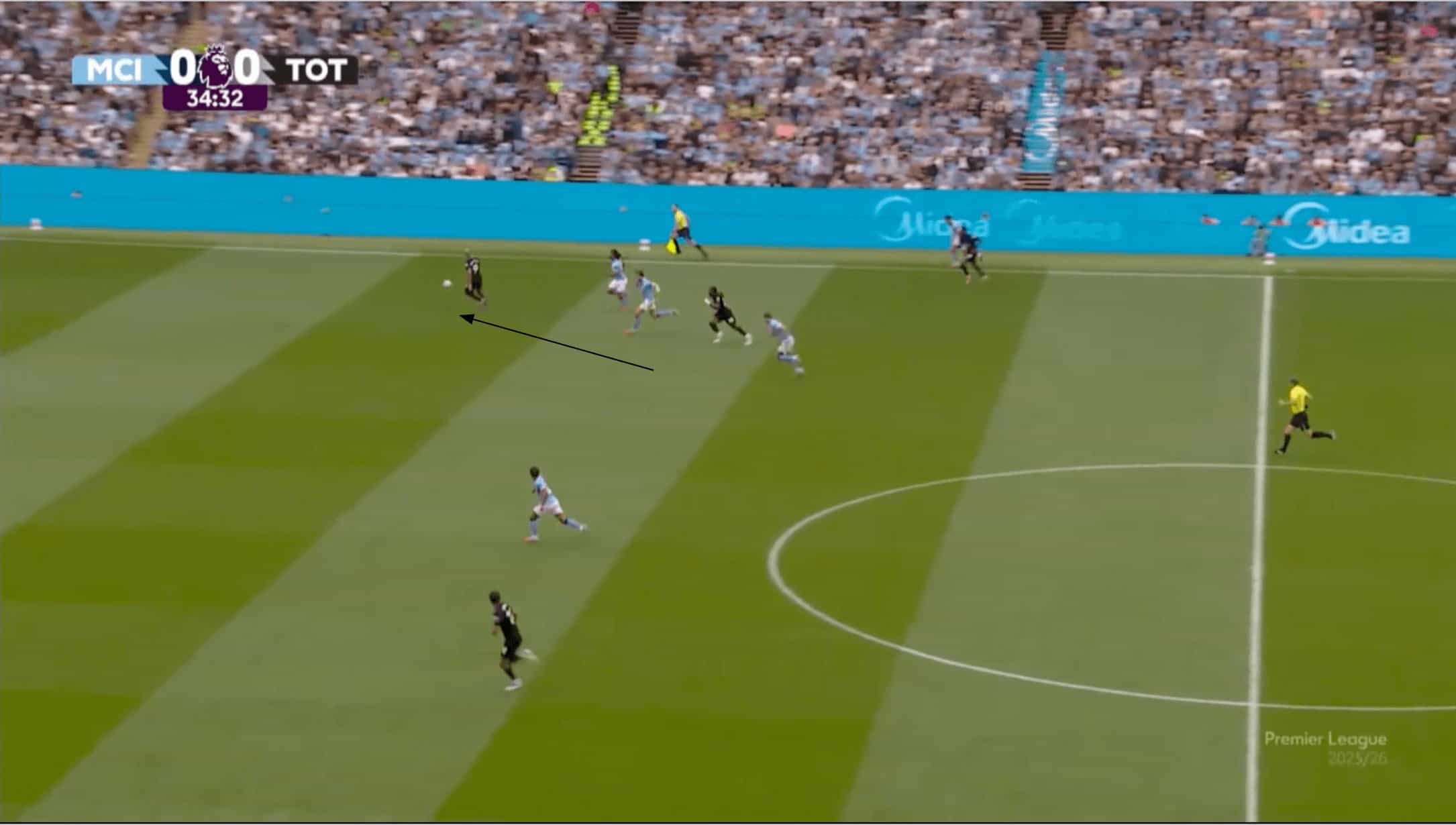 Porro plays the long ball forward, targeting space behind City’s right-back.