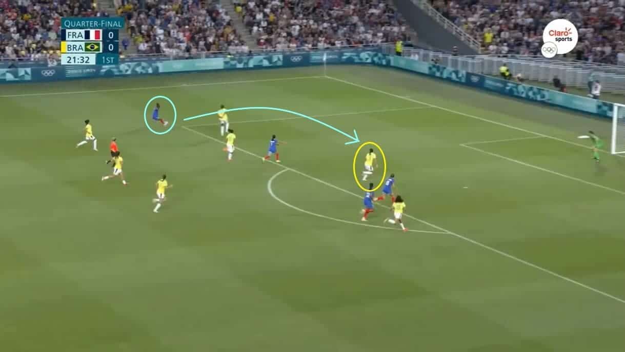 However, she was quickly closed down by Antônia whilst left wing-back Yasmim tucked in to ensure that Brazil could maintain a four-player structure in front of goal.